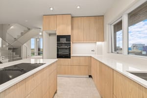 Eldhústæki: skilast með tækjum og búnaði frá Siemens, spanhelluborði, blástursofni, örbylgjuofni, innbyggðum ísskáp og uppþvottavél. Háfur eru innbyggður í helluborði í eyju.