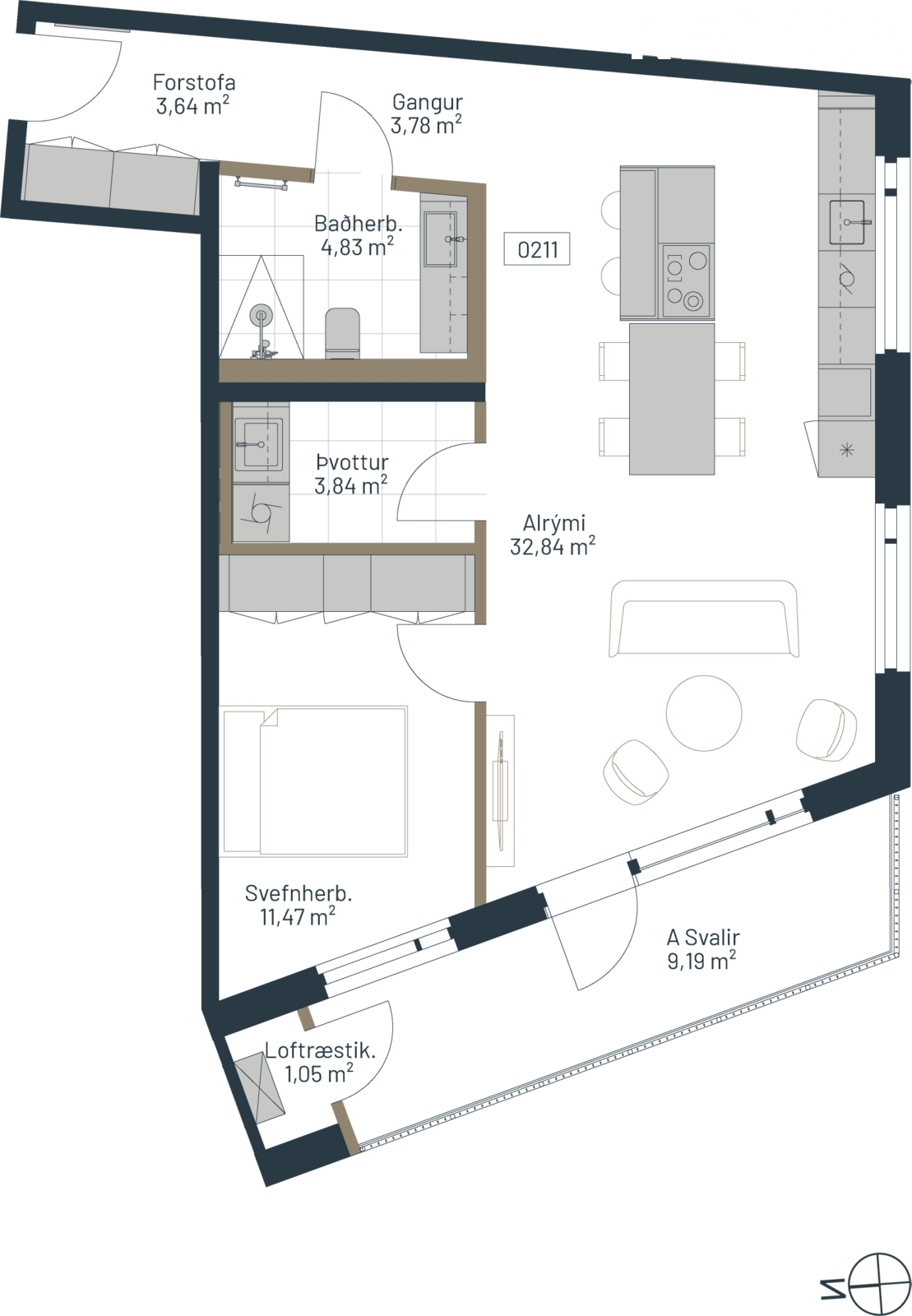 Íbúð 211: Vel skipulögð og björt 79 fm tveggja herbergja íbúð á annari hæð. Eyja í eldhúsi, þvottahús innan íbúðar, svalalokun á rúmgóðum 9,2 fm svölum klæddar með vönduðum bambus. Bílastæði fylgir eigninni í bílakjallara. 5,9 fm geymsla í sameign.