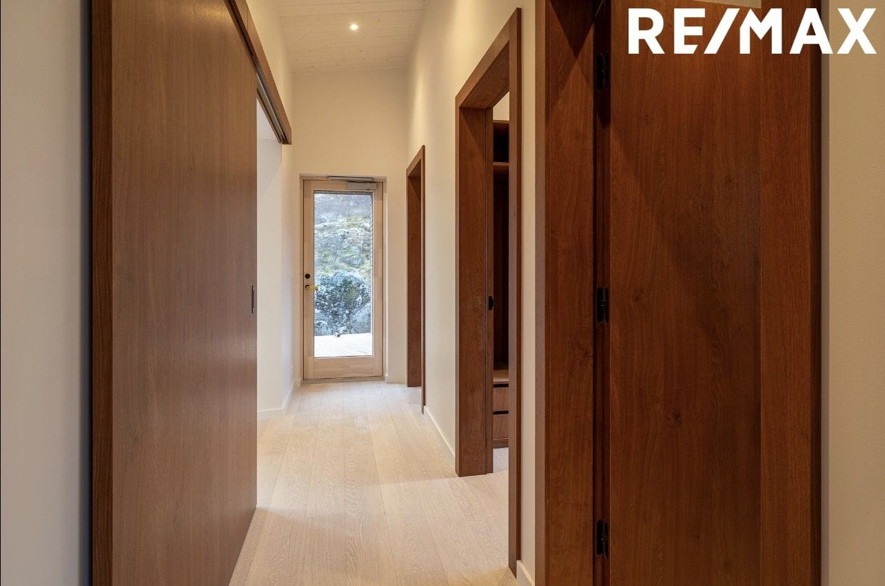 Allar innihurðir eru úr ljósum viðarspón. Veggir eru málaðir í ljósum lit (slétt yfirborð), loft klædd með hvíttuðu timbri og gólf með ljósu parketi. Útgengt er úr stofu út á sólpall.
