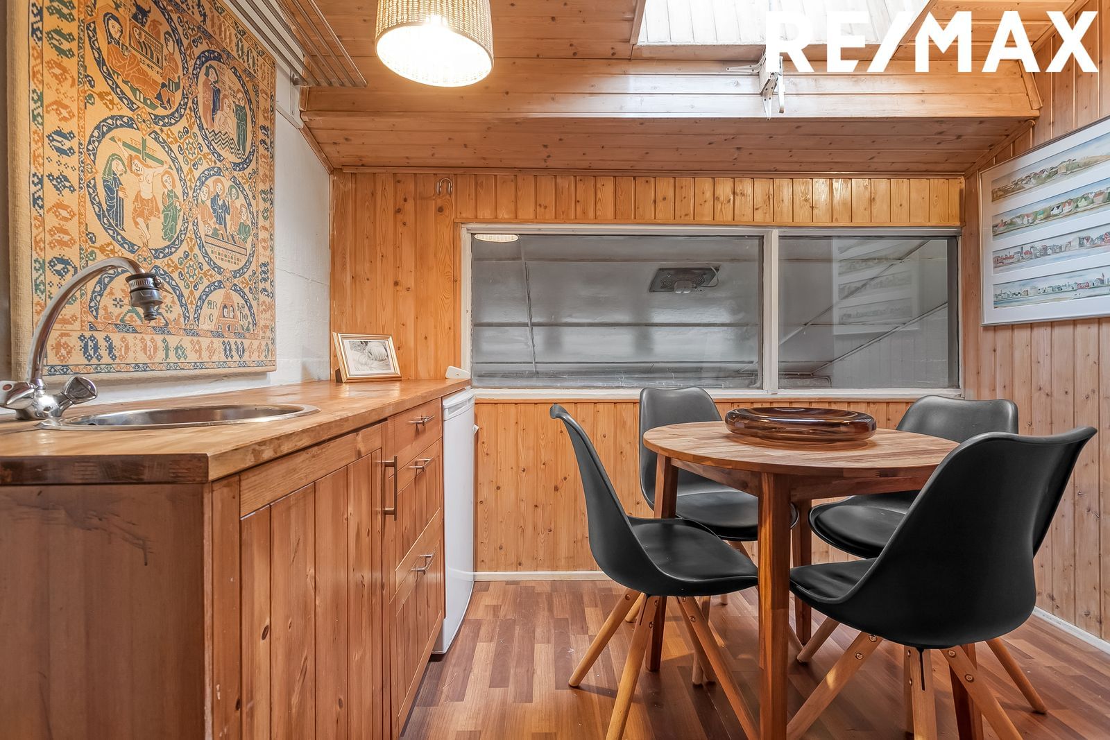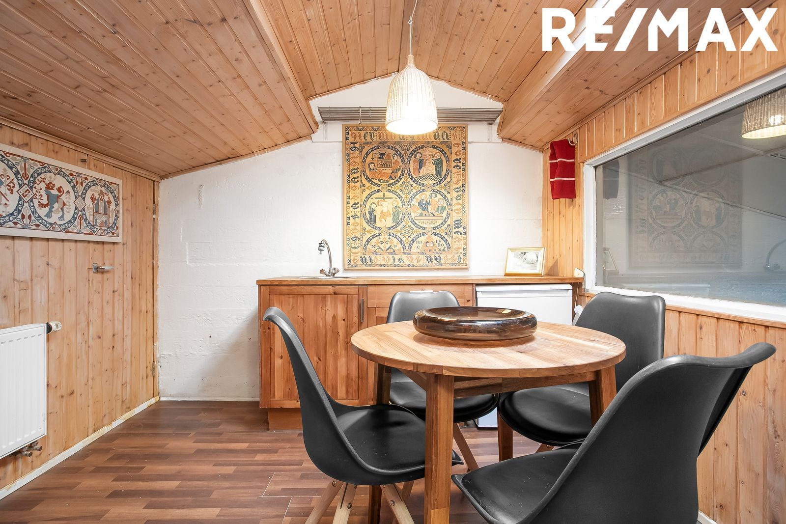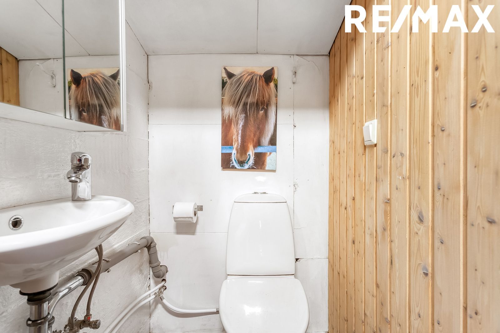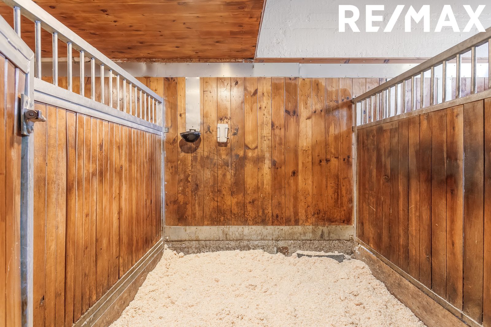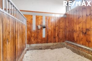 Kaffistofa: Kaffistofa er snyrtileg og klædd með við að innan. Gluggi í kaffistofu veiti útsýni yfir stíur í hesthúsi.