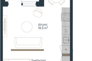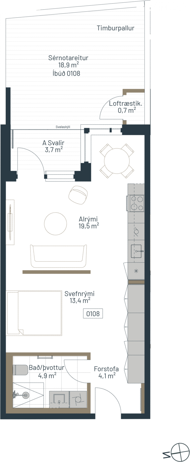 Íbúð 108: Vel skipulögð, 55,0 m2 stúdíó íbúð á jarðhæð með rúmgóðum 18,9 fm sérafnotareit með timburpalli.