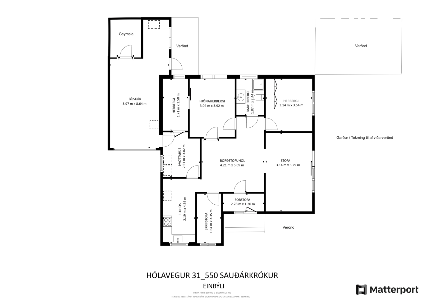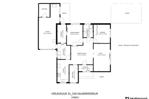 Fasteignamat 2026 verður skv HMS kr. 70.250.000 kr. Núverandi skipulag eignar:Forstofa, hol/borðstofa, stofa, eldhús, gangur, herbergi, herbergi, herbergi með innangengu herbergi/fataherbergi, þvottahús, bílskúr.