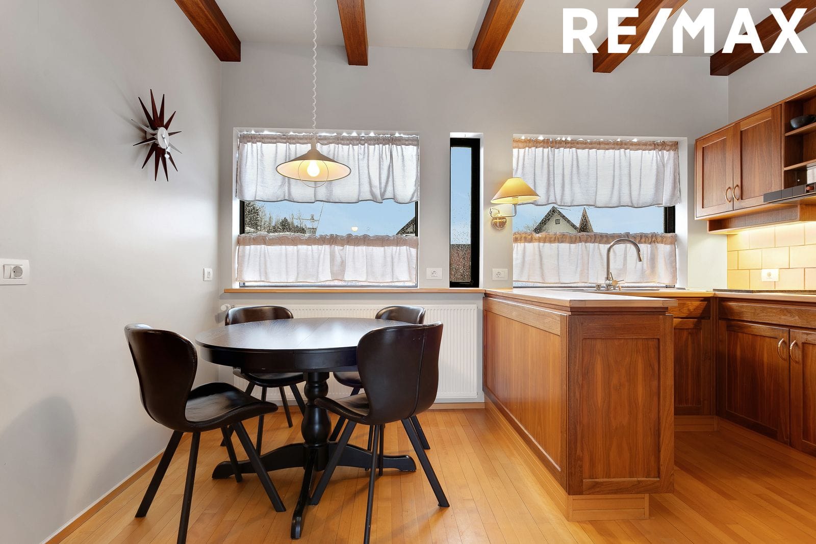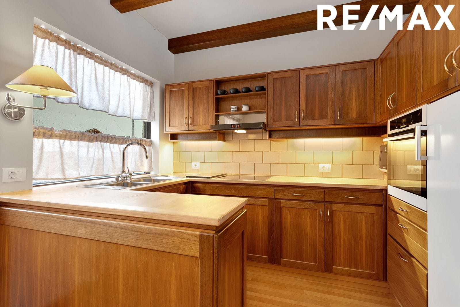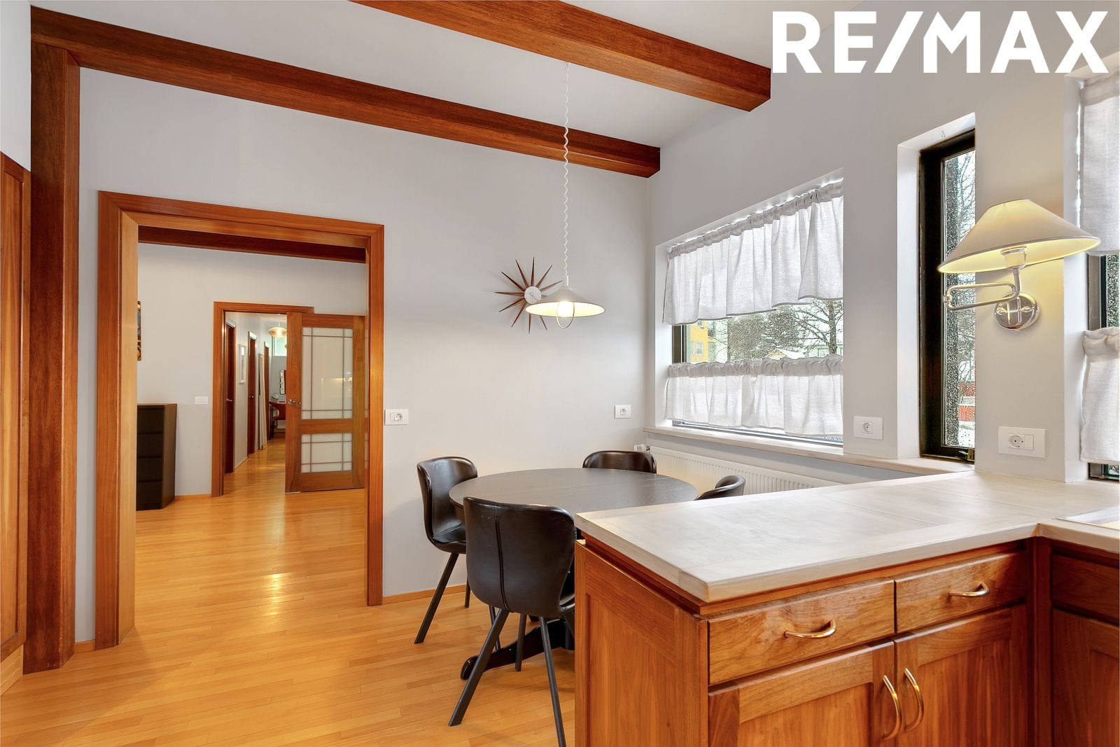 Eldhús er með fallegri viðarinnréttingu, góðu skápaplássi, ofni í vinnuhæð og helluborði. Bjartur borðkrókur og stórir gluggar. Inn af eldhúsi er gott búr með hillum.