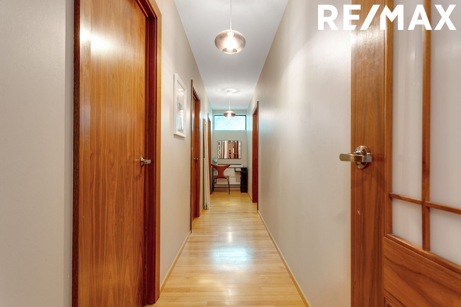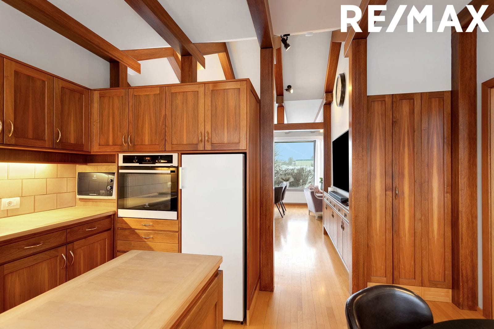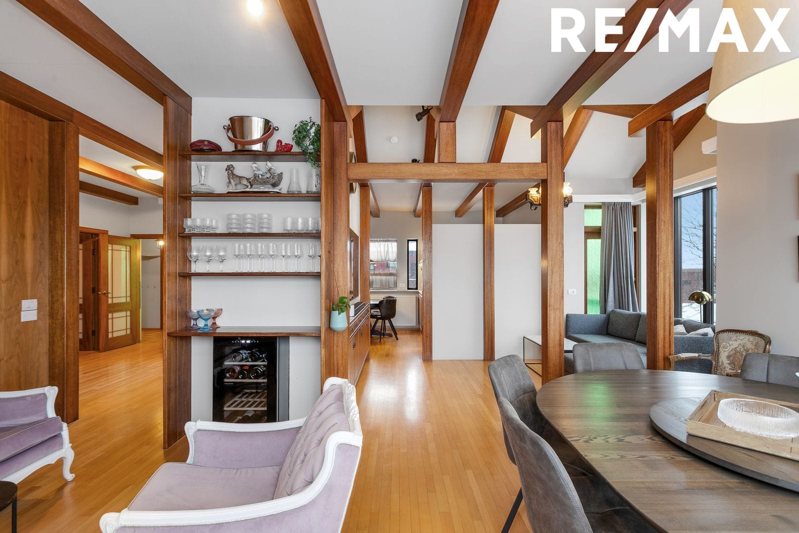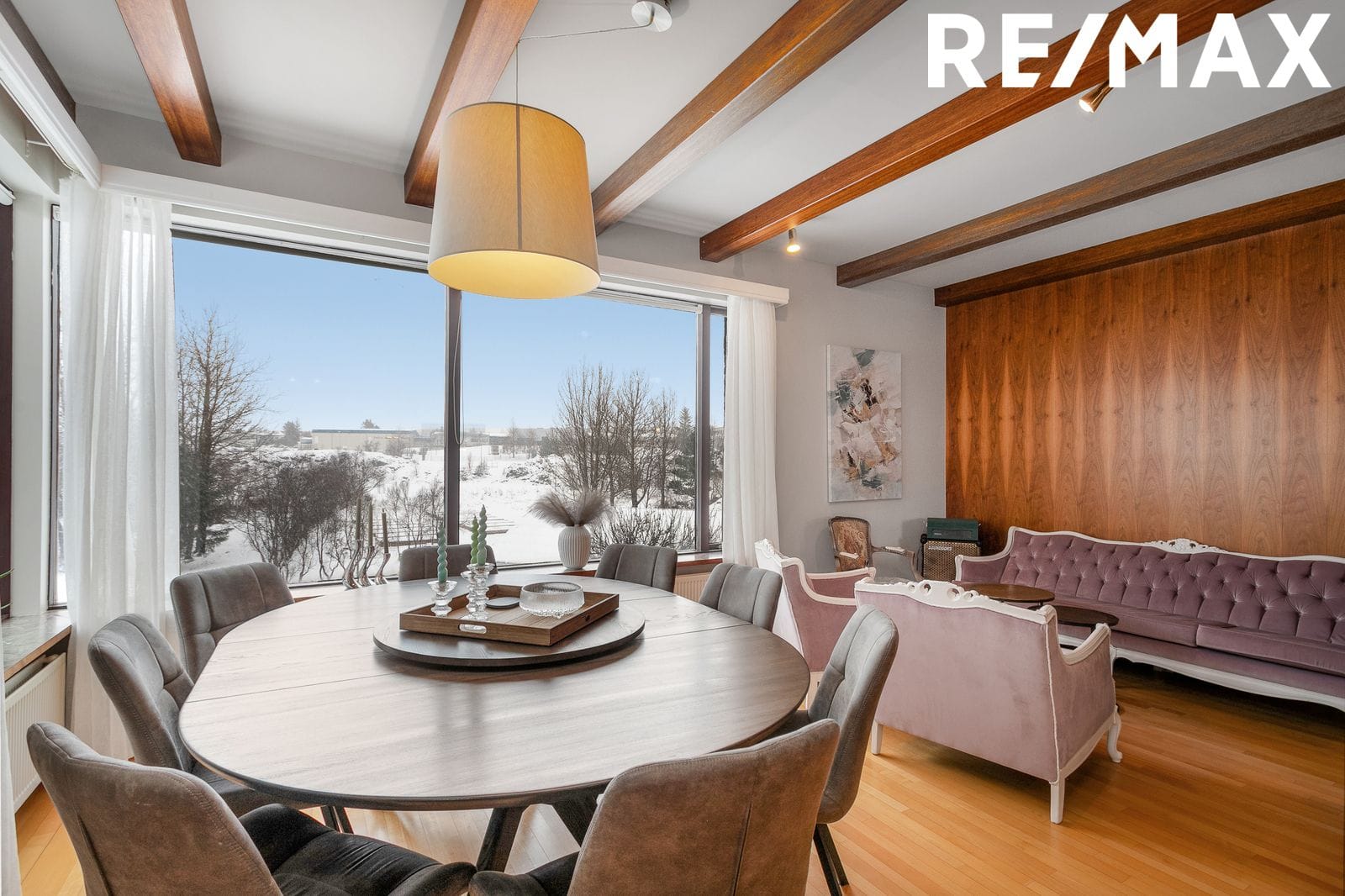 Miðrými hússins er einstaklega rúmgott og bjart með mikilli lofthæð, gegnheilu niðurlímdu beikiparketi og sérsmíðuðum viðarpanelum sem setja hlýlegan og vandaðan svip á eignina.