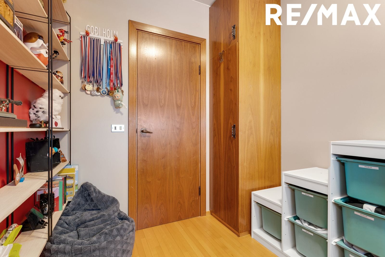 Á hæðinni eru fjögur svefnherbergi: rúmgott hjónaherbergi með fataskáp og þrjú barnaherbergi.