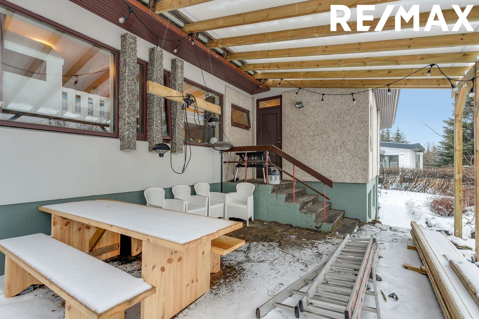 Aðkoma að húsinu er afar snyrtileg. Steypt innkeyrsla með snjóbræðslu og tveggja stæða bílaplani. Rafdrifin snjóhitabræðsla er í hluta stéttar og tröppum. Steyptar tröppur með fallegu handriði að aðalinngangi, að hluta er handrið klætt með kopar. Lóðin er gróin og falleg, með viðarpalli að framan með skjólgirðingu og nýlegum yfirbyggðum palli að hluta á baklóð.