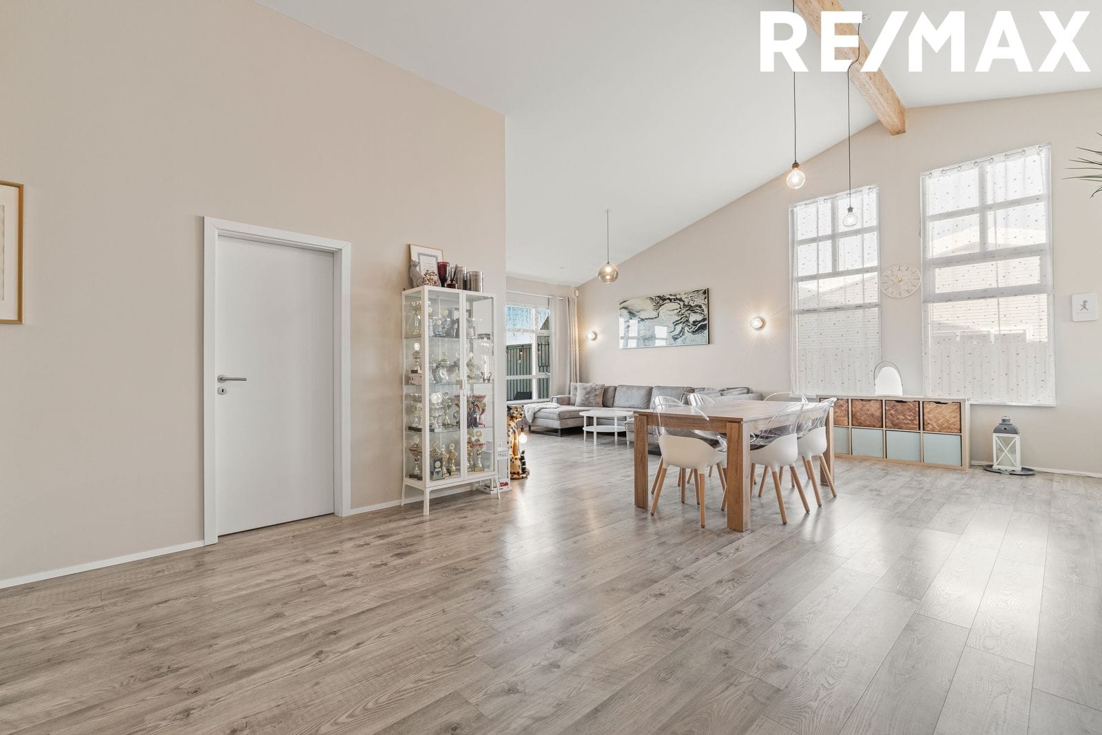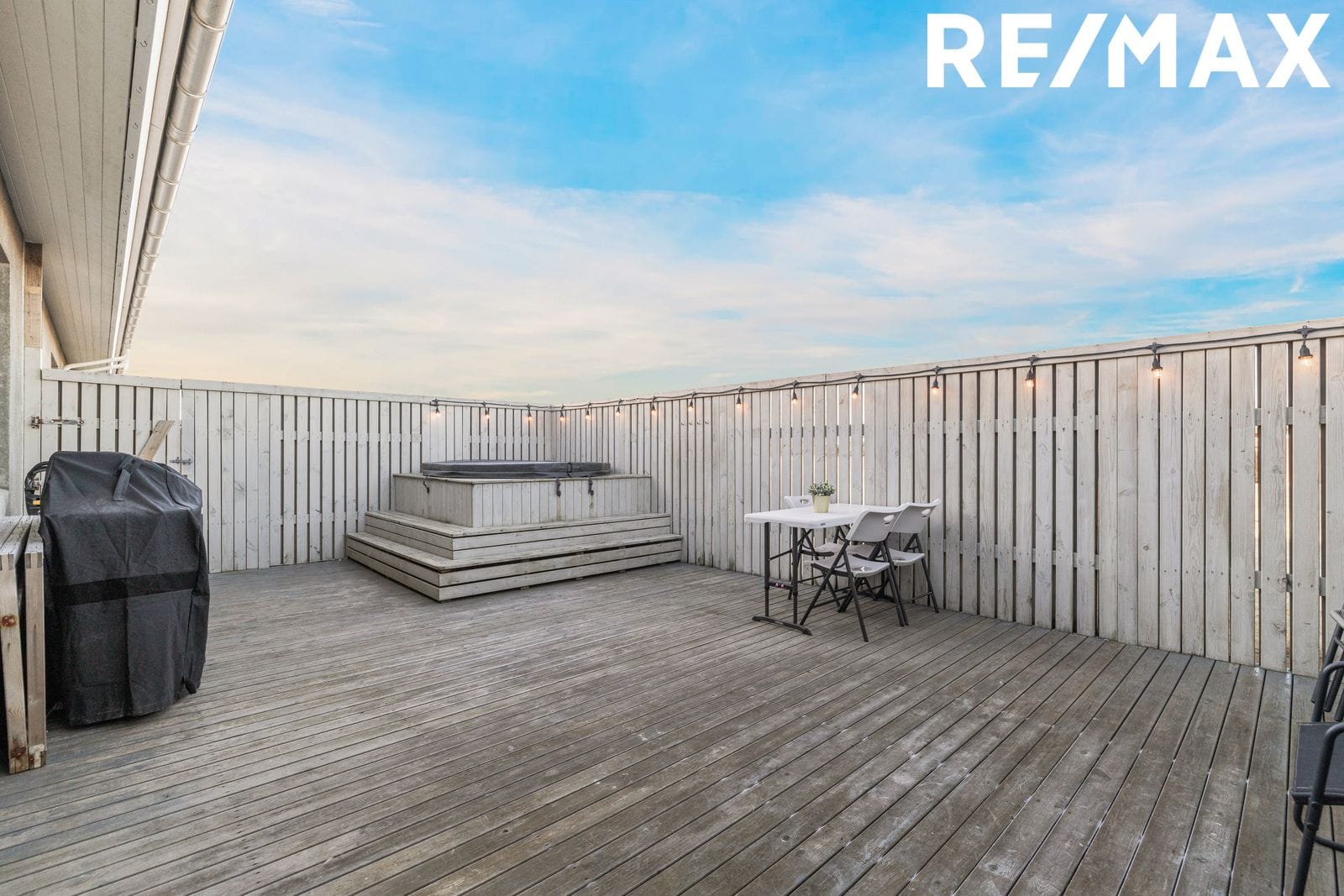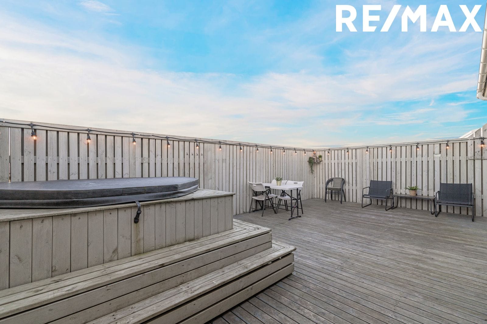 Stofa og borðstofa er bjart rými með gluggum á tvo vegu og útgengi er út á sérafgirta viðarverönd með heitum potti. Aftan við verönd er grasflötur og opið svæði tengist því.