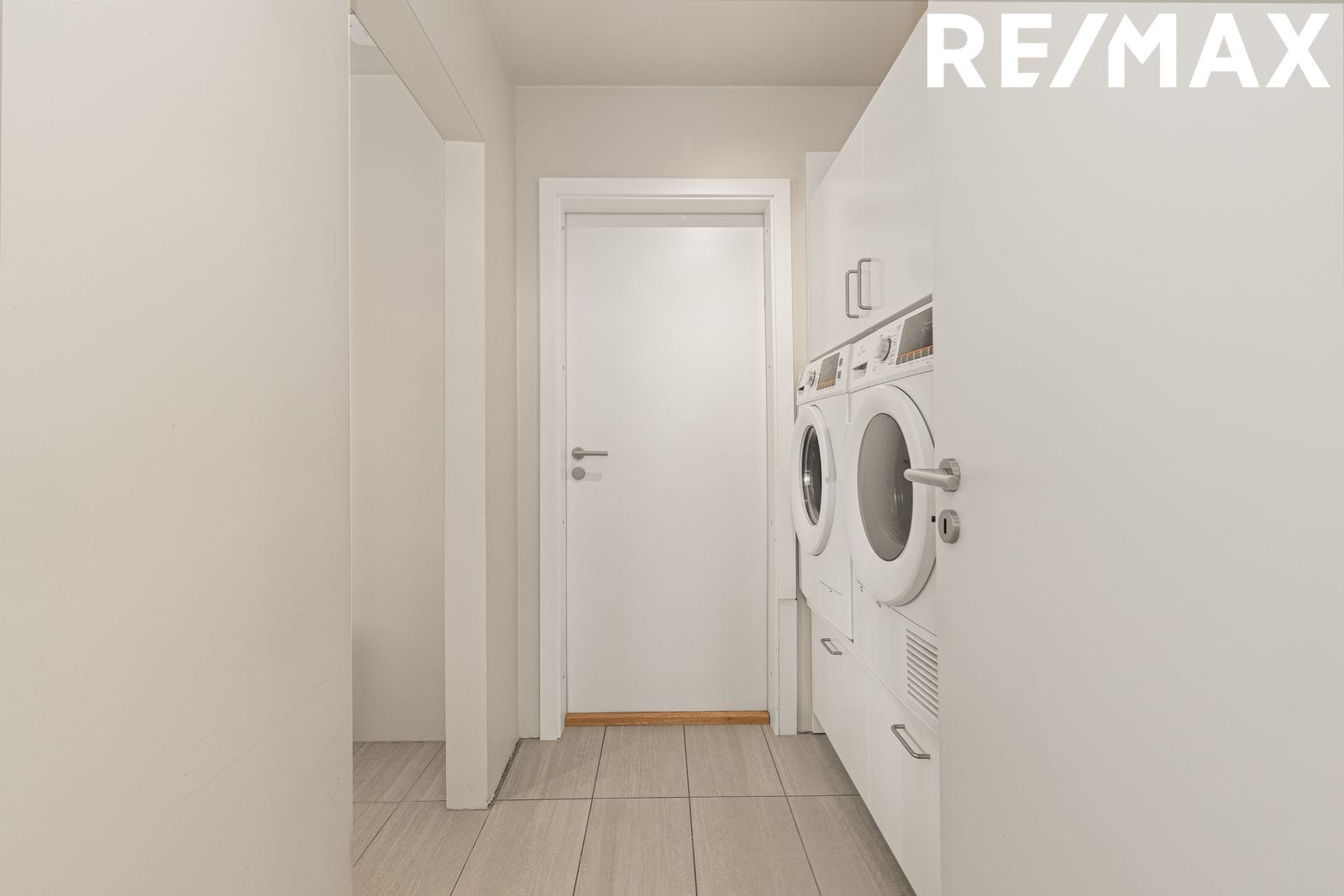 Þvottahús er inn af holi. Þaðan er gengið inn í bílskúr. Hvít innrétting með stæði og tengi fyrir þvottavél og þurrkara í vinnuhæð. Ljósar gólfflísar.