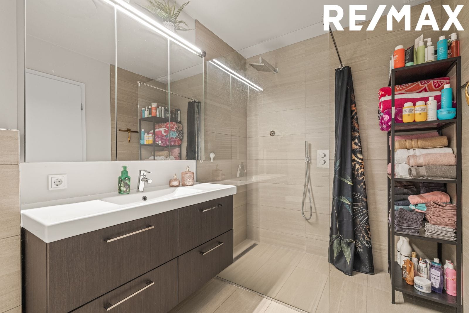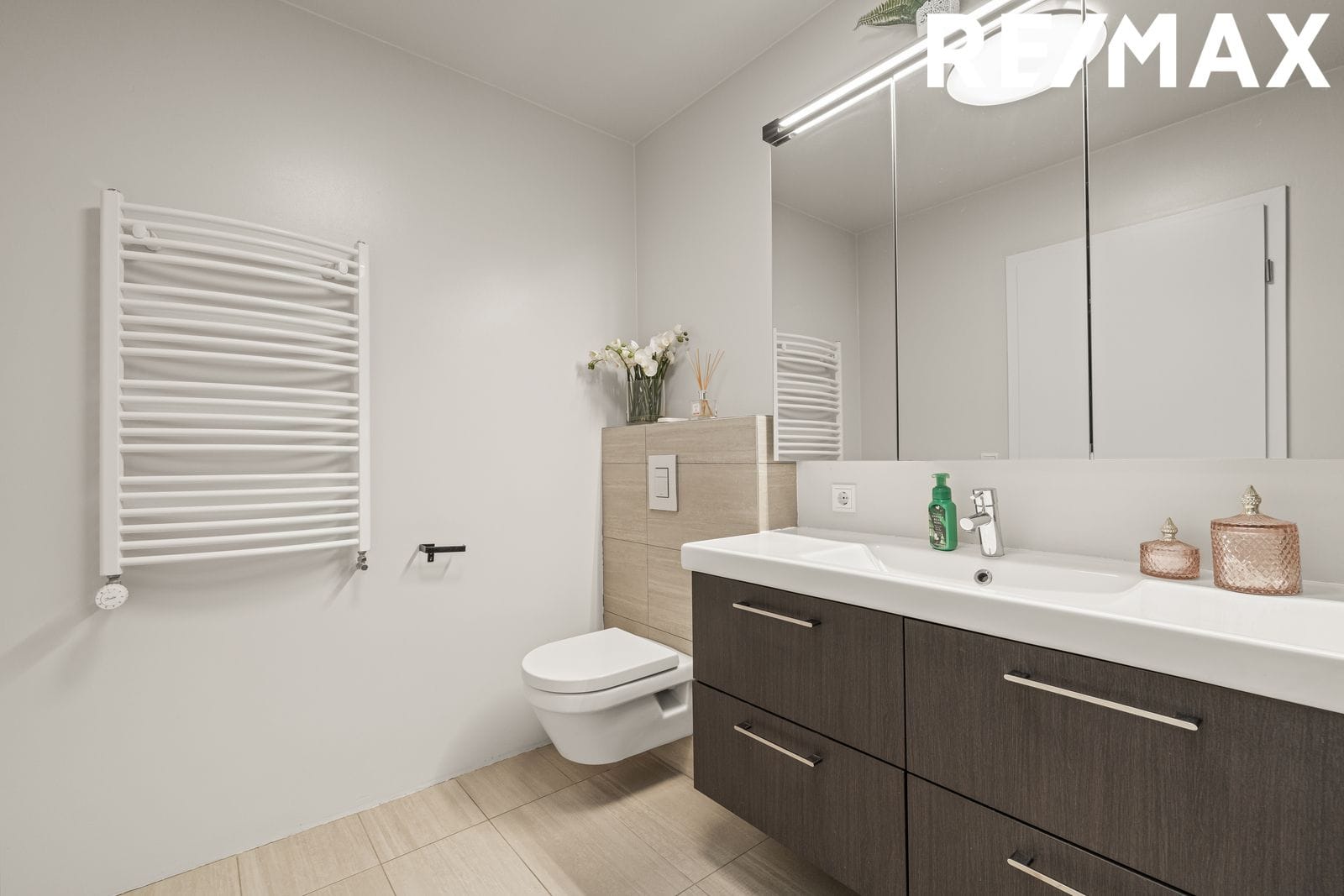 Baðherbergi er með dökkri innréttingu undir handlaug, veggfestum speglaskápi með ljósi, upphengdu salerni, hvítum handklæðaofni og þreplausri sturtu með gleri.