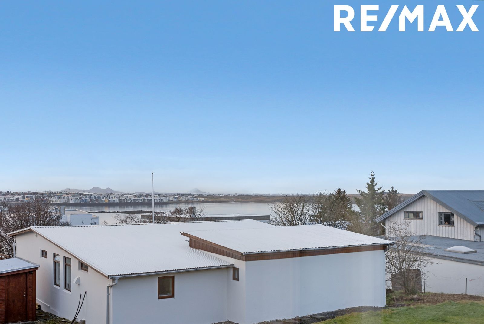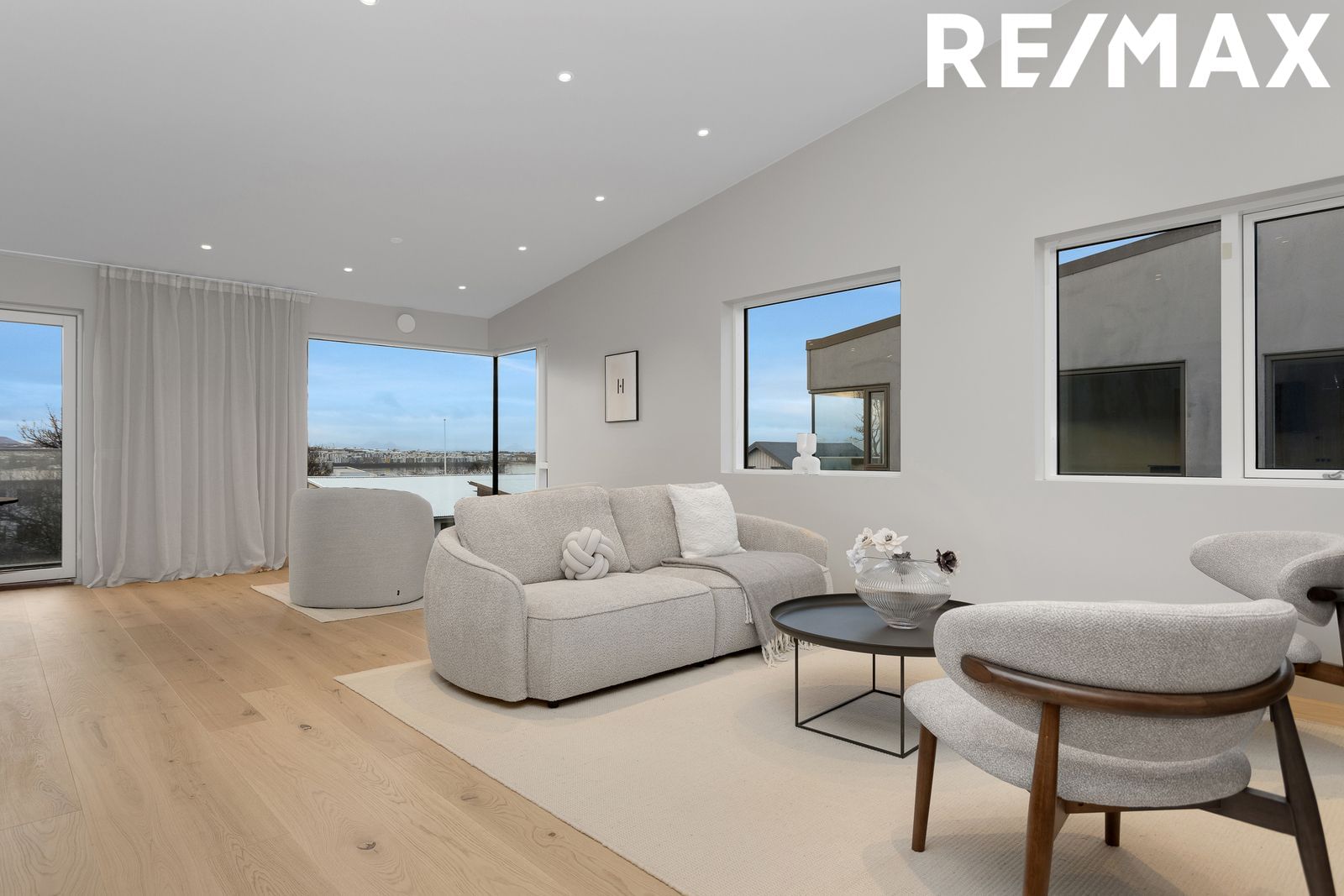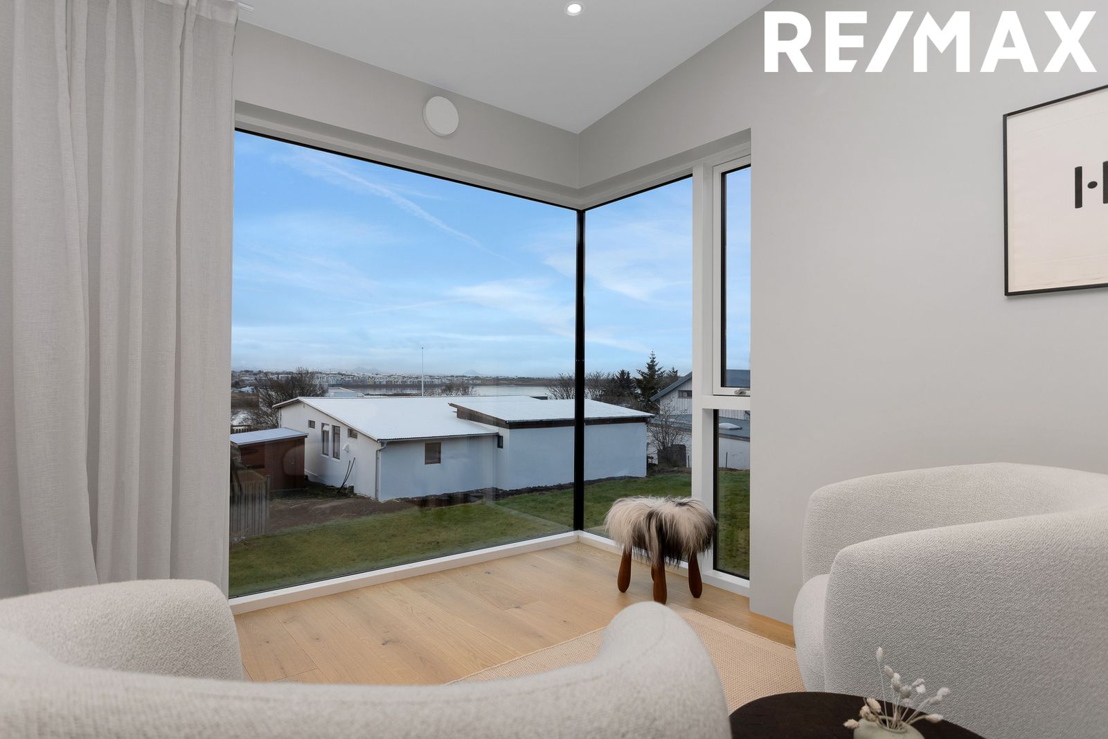 Efri hæð:Stofan og eldhúsið er í opnu alrými. Fallegt útsýni yfir byggð og til sjávar. Gólfsíður gluggi og horngluggi sem gefa eigninni mikinn sjarma (enginn gluggapóstur í horninu).
