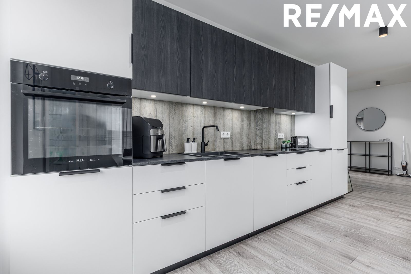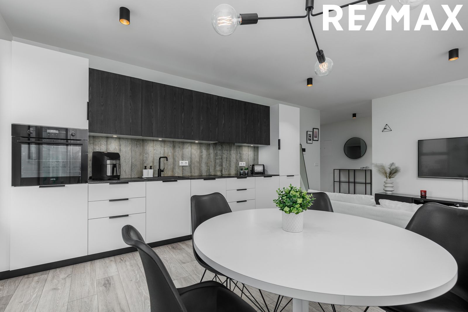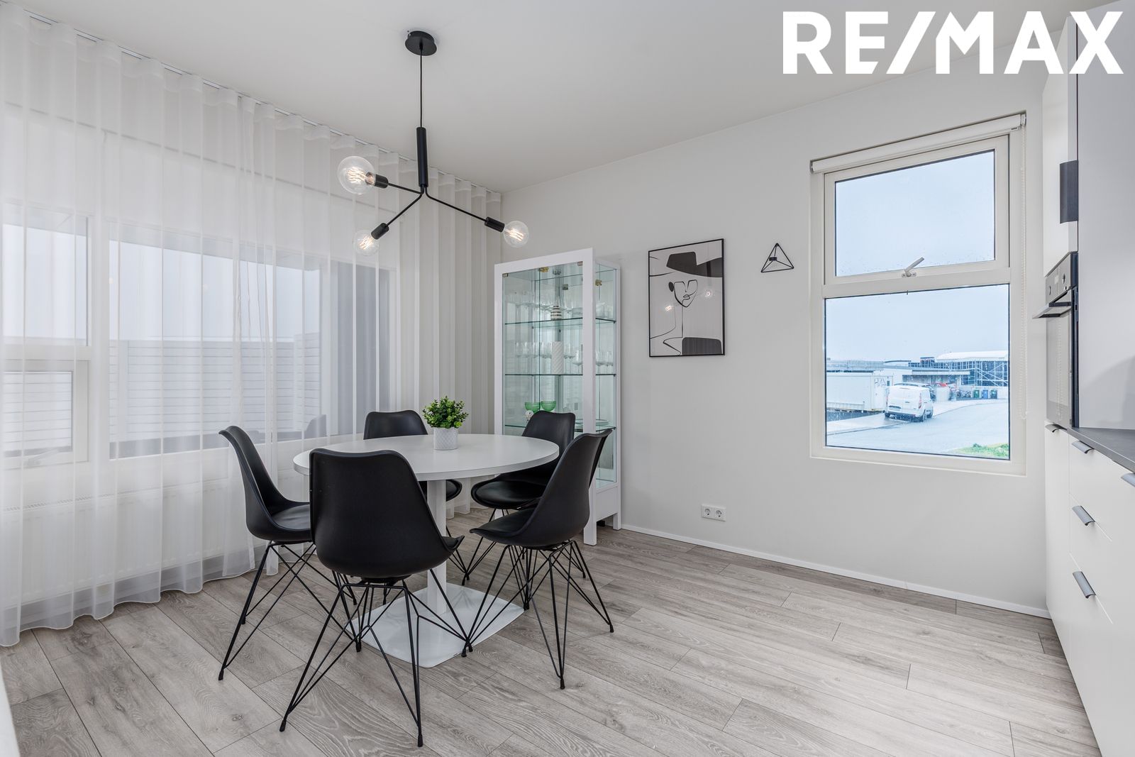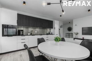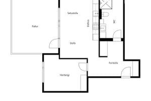 Stofa/borðstofa/eldhús: Harðparket á gólfi. Bakstursofn í vinnuhæð. Innbygður kæli/frystiskápur sem og uppþvottavél. Hvít/svört eldhúsinnrétting. Spansuðuhelluborð.