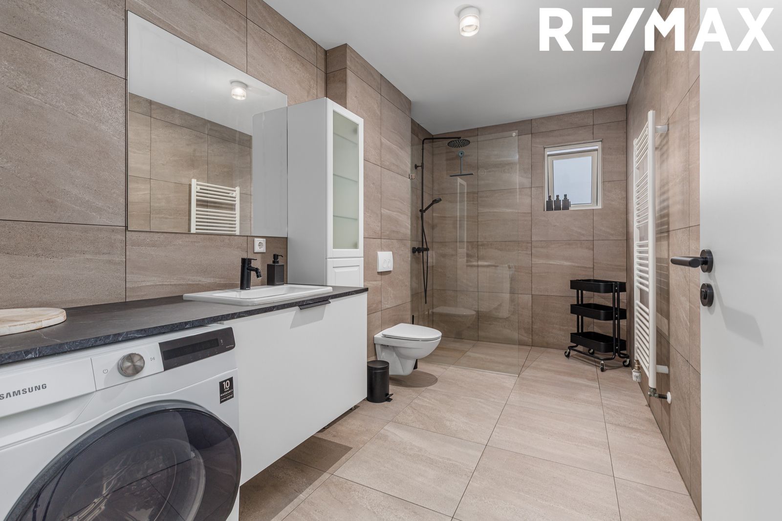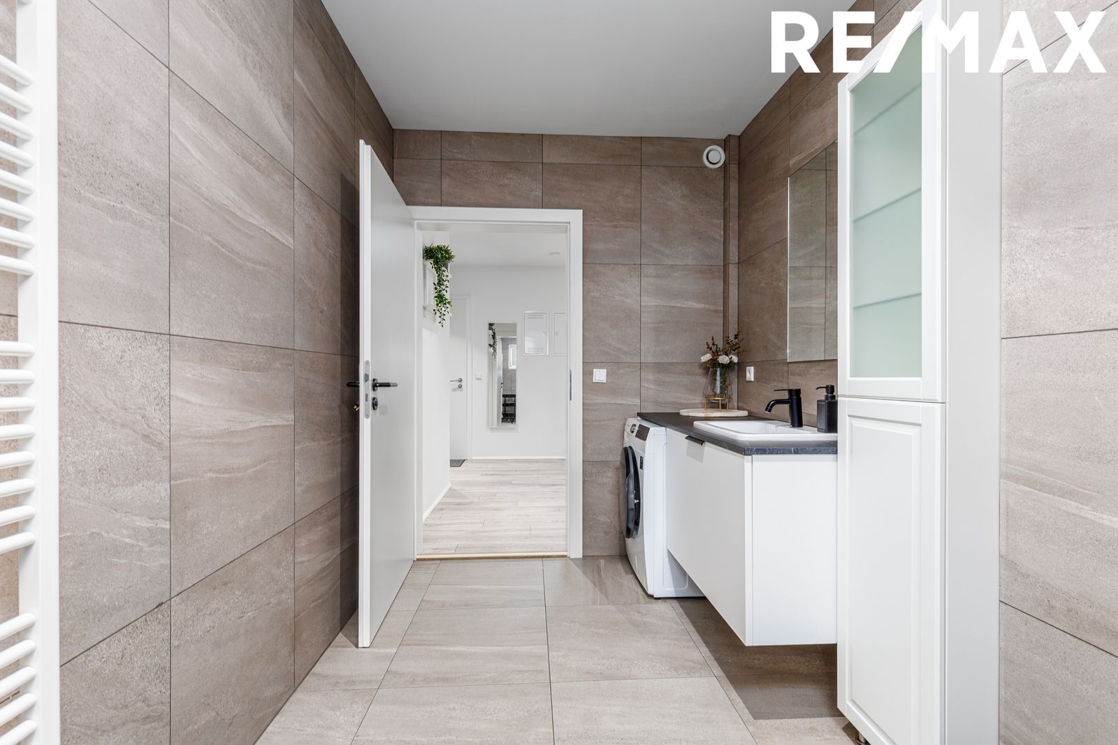 Baðherbergi: Flísalagt í hólf og gólf. Inngöngusturta með glerþili. Hvít innrétting með handlaug. Tengi fyrir þvottavél eru á baðherbergi. Handklæðaofn. Gluggi er í rýminu.