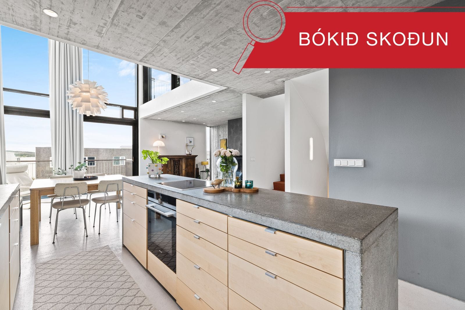 Alrými með eldhúsi, borðstofu og stofu: Eldhúsið er með hvítum skápum og innbyggðum ísskáp á endavegg. Einnig er innrétting eftir austurvegg og samhliða þeirri einingu er frístandandi eyja í stíl með beyki og sérsteyptum borðplötum sem tóna vel við sjónsteypuna. Bakaraofn er undir borði í eyju, spanhelluborð. Tengi fyrir uppþvottavél við vask. Það er mjög gott skápa/ skúffupláss í innréttingunni. Opnanlegur gluggi til austurs.