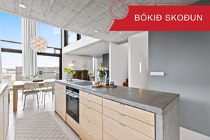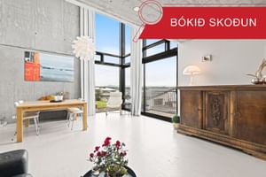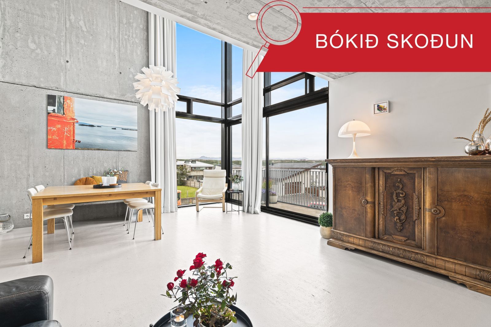 tvöfaldri lofthæð sem tengir seman efri hæðina við aðalhæðina, og gefur góða birtu og tengingu við nærumhverfið með einstaklega skemmtilegum gluggum hólf í gólf og sérsaumuðum gardínum. Útgengi er út á