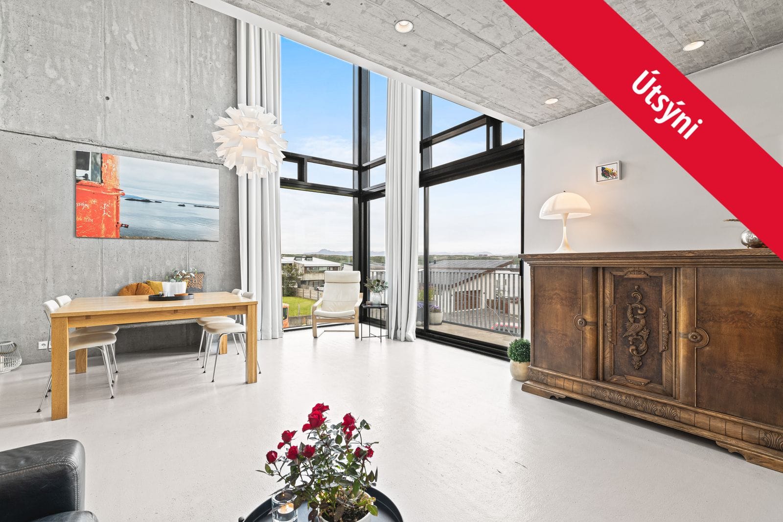 tvöfaldri lofthæð sem tengir seman efri hæðina við aðalhæðina, og gefur góða birtu og tengingu við nærumhverfið með einstaklega skemmtilegum gluggum hólf í gólf og sérsaumuðum gardínum. Útgengi er út á