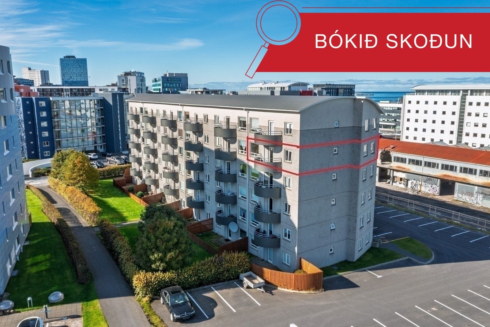Bílastæði: Sérmerkt bílastæði merkt íbúðinni fyrir framan húsið, og fullt af gestastæðum.
