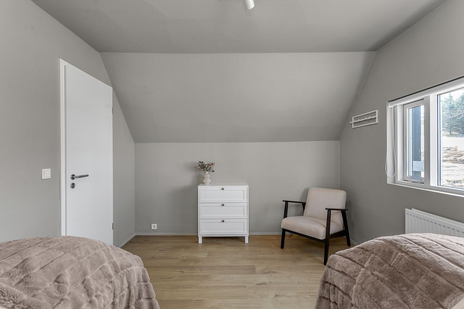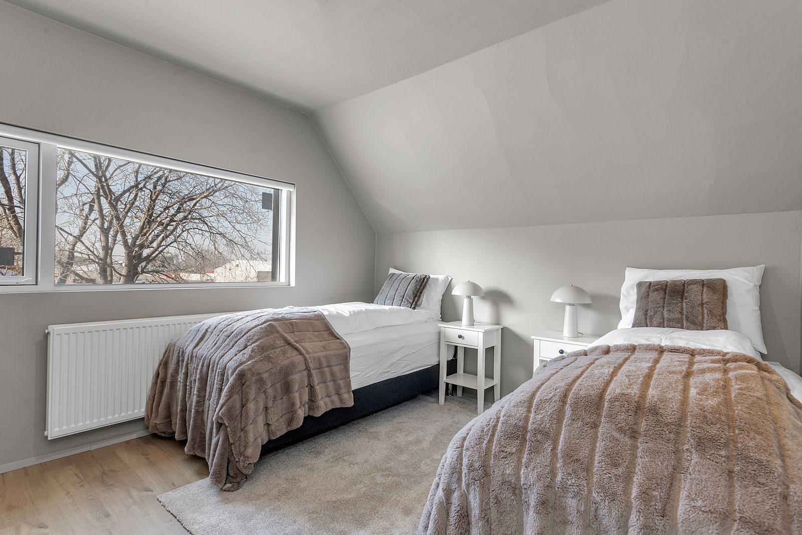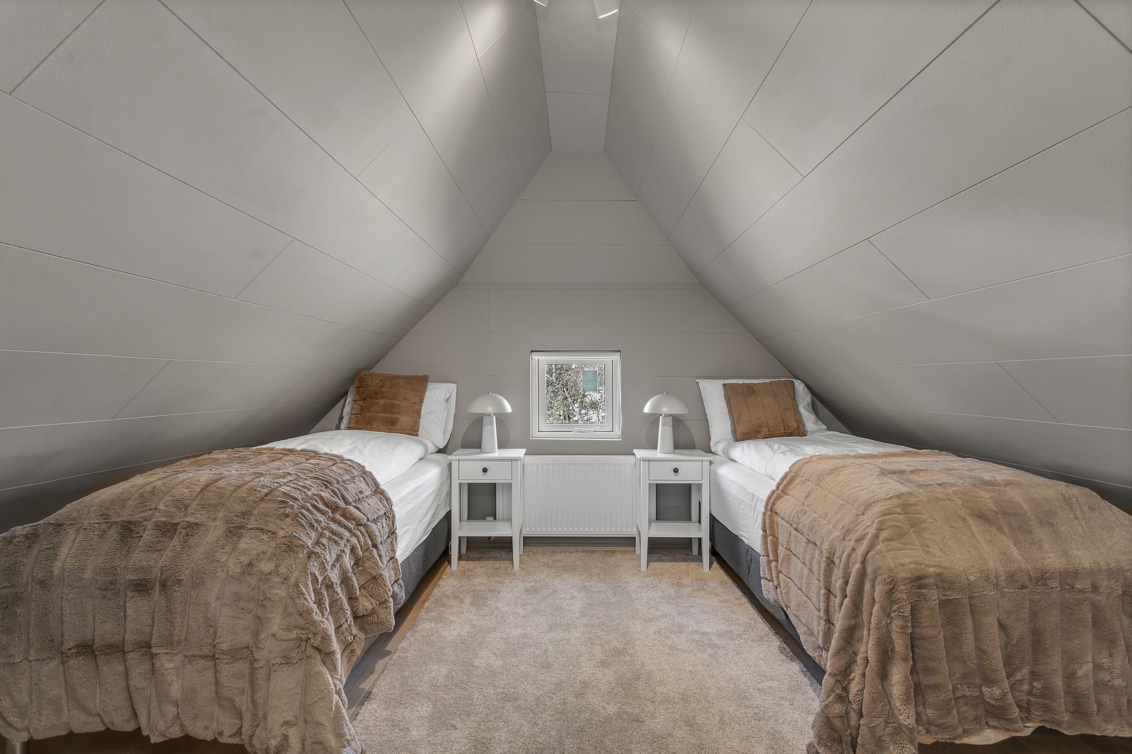 rúmgott svefnherbergi undir súð með góðri lofthæð í miðjunni.