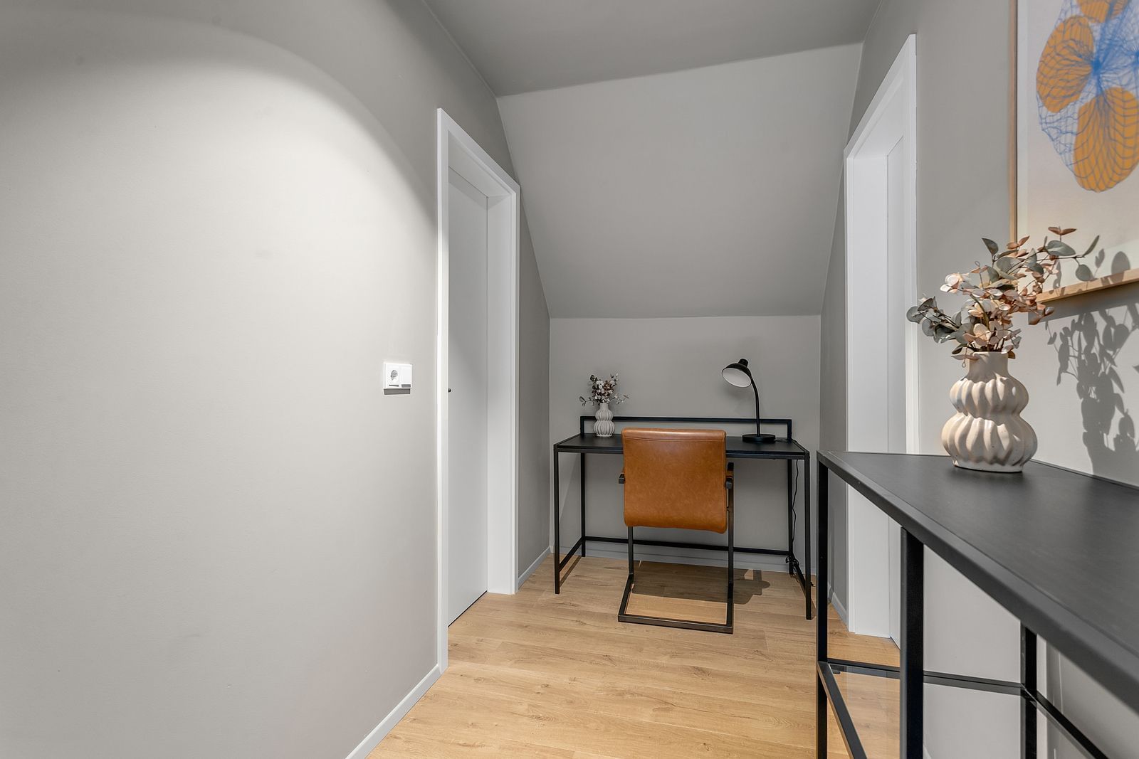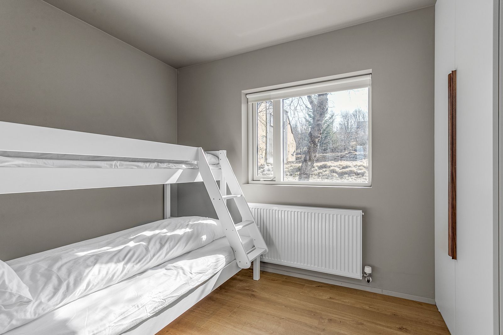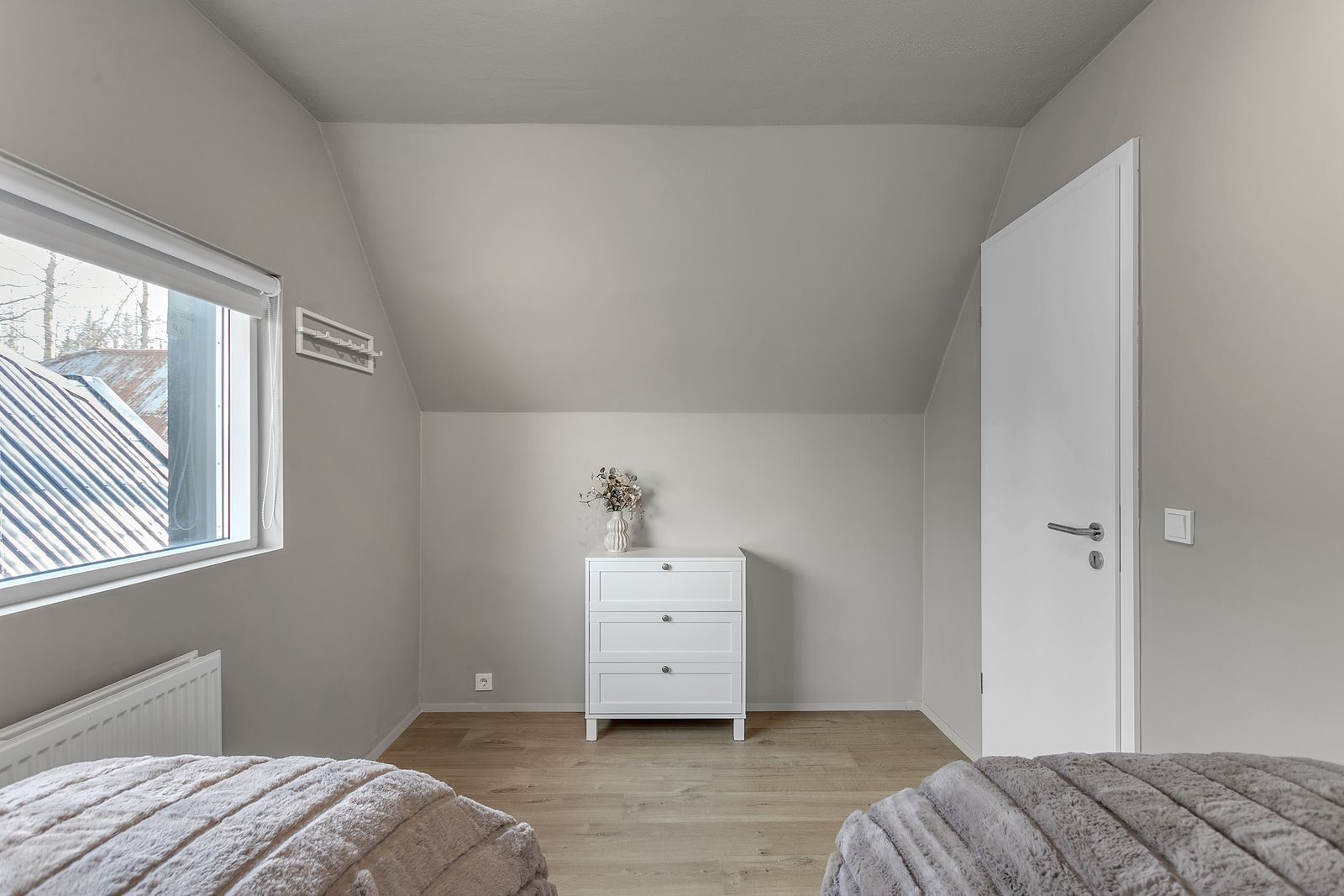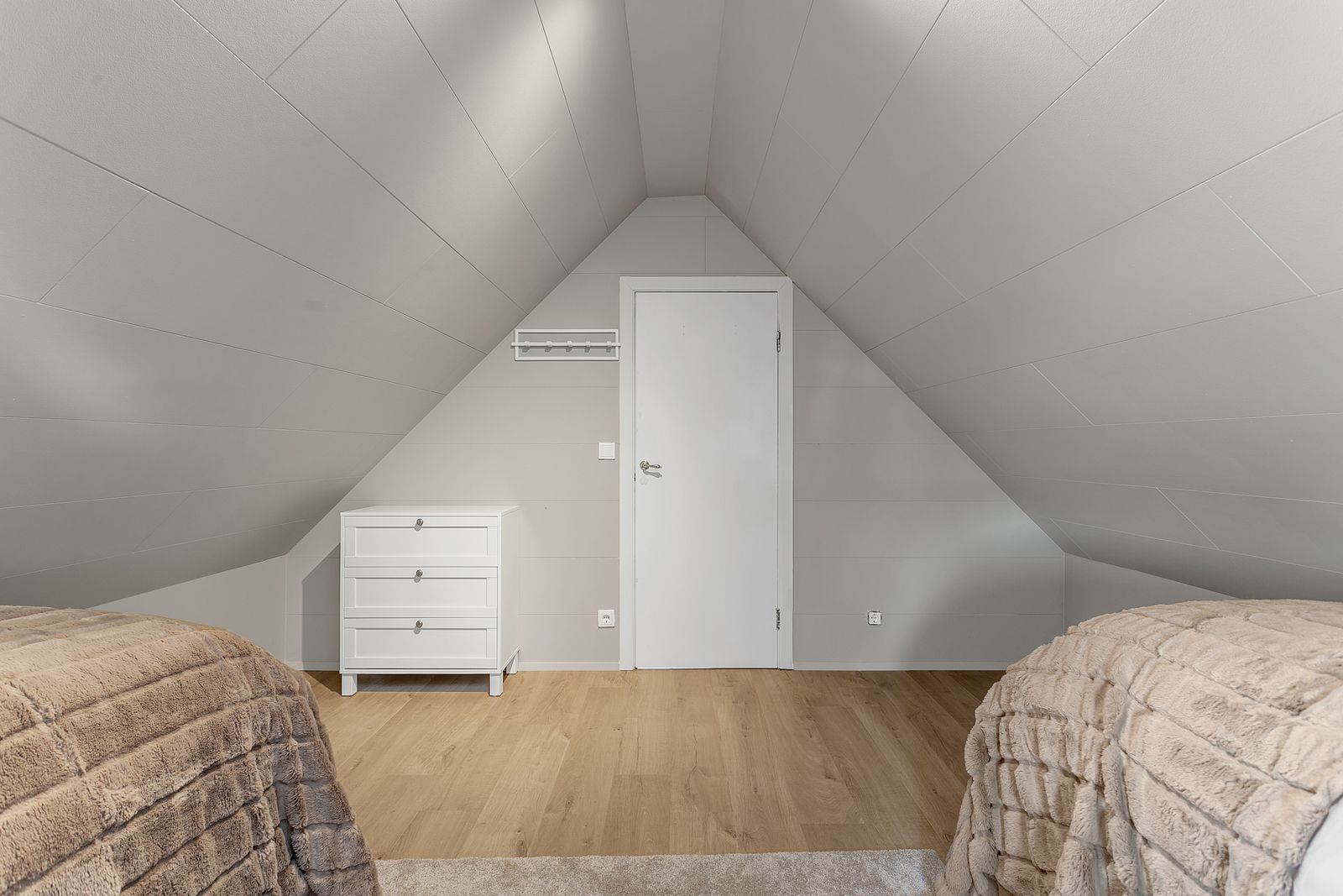 rúmgott svefnherbergi undir súð með góðri lofthæð í miðjunni.