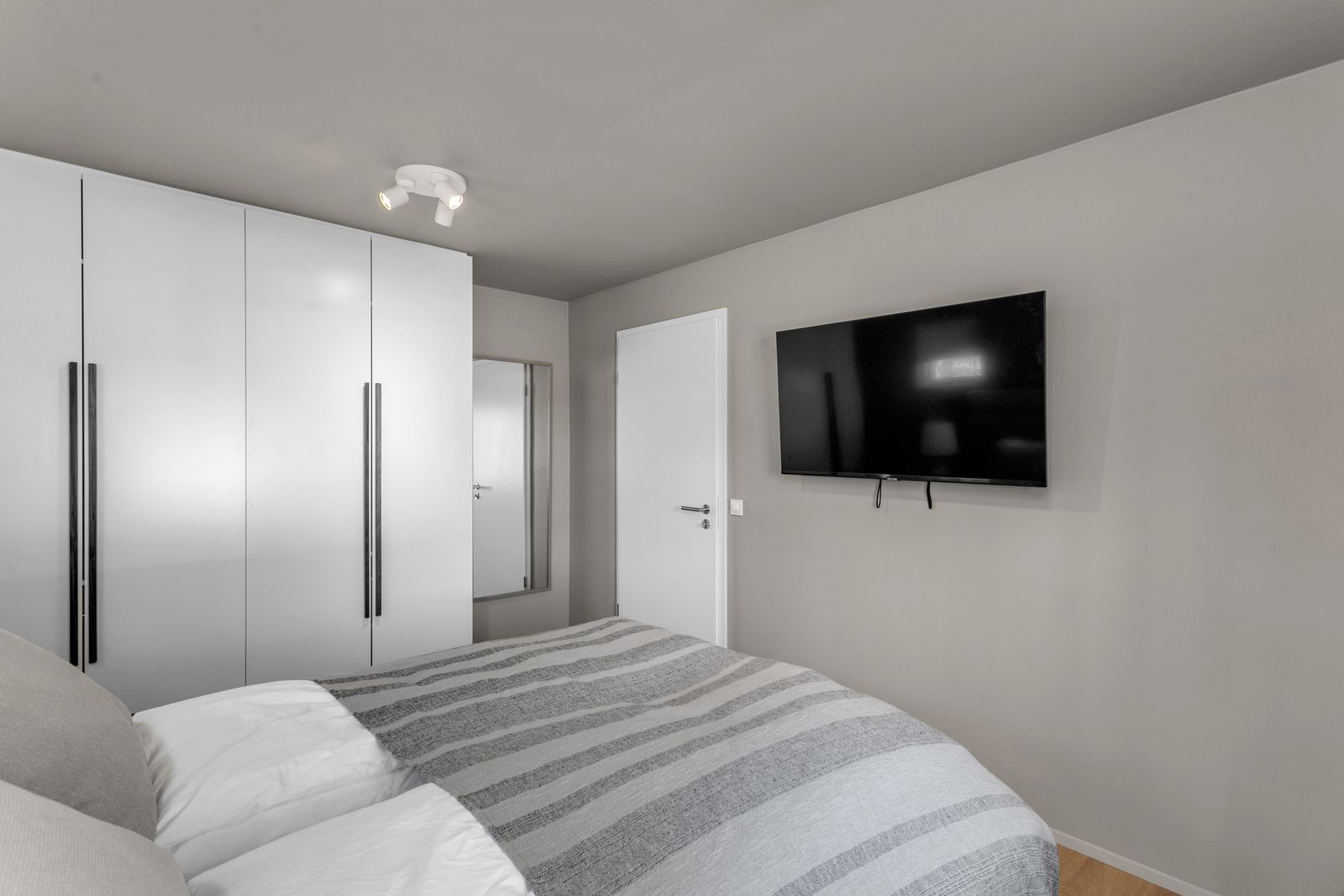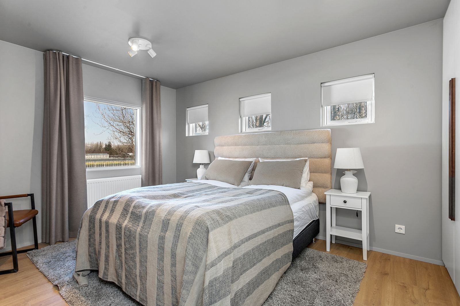 Hjónaherbergi: rúmgott með fataskáp og parketi á gólfi.