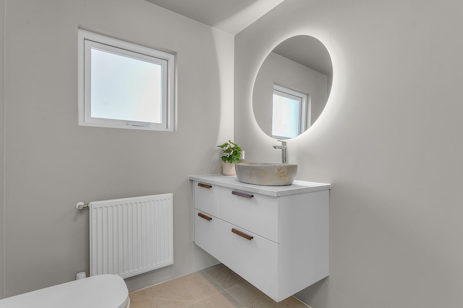 Baðherbergi: með fallegri HTH innréttingu, stórum spegli með innfelldri lýsingu, sturtu, upphengdu salerni og flísum á gólfi.