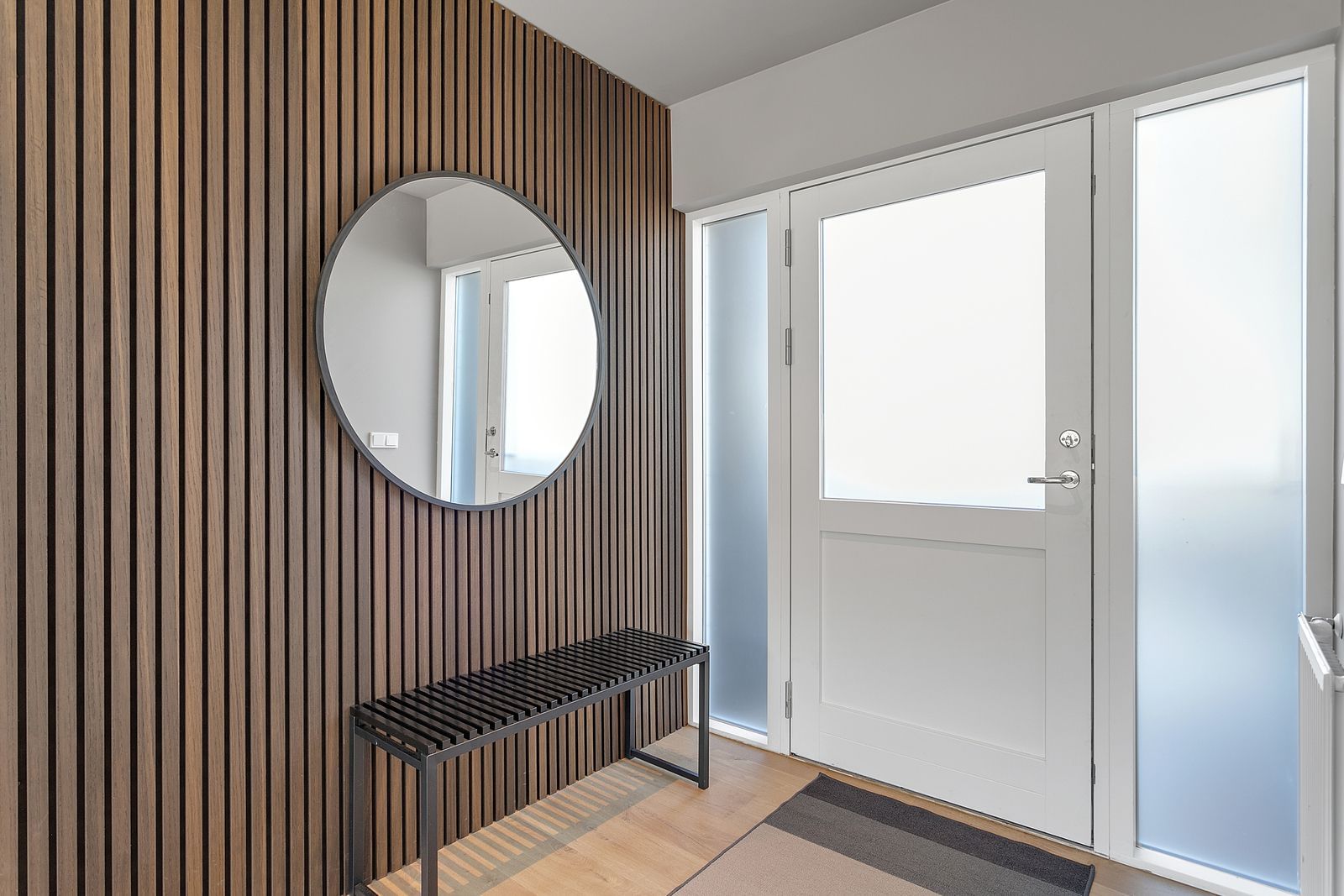 Forstofa: björt og opin forstofa með gluggum sitthvoru megin við útidyrahurð með parketi á gólfi.