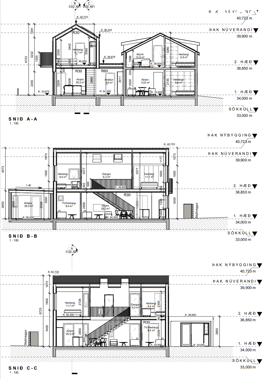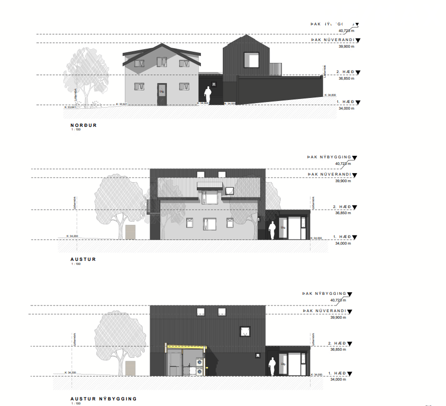 Núverandi áform gera ráð fyrir að nýbyggingin verði út timbri og klædd með álklæðningu.