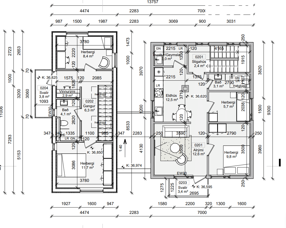 0102: Teikningar af nýju húsi (2 íbúðir) + bílskúr (stúdíóíbúð) samtals:130,4 fm
