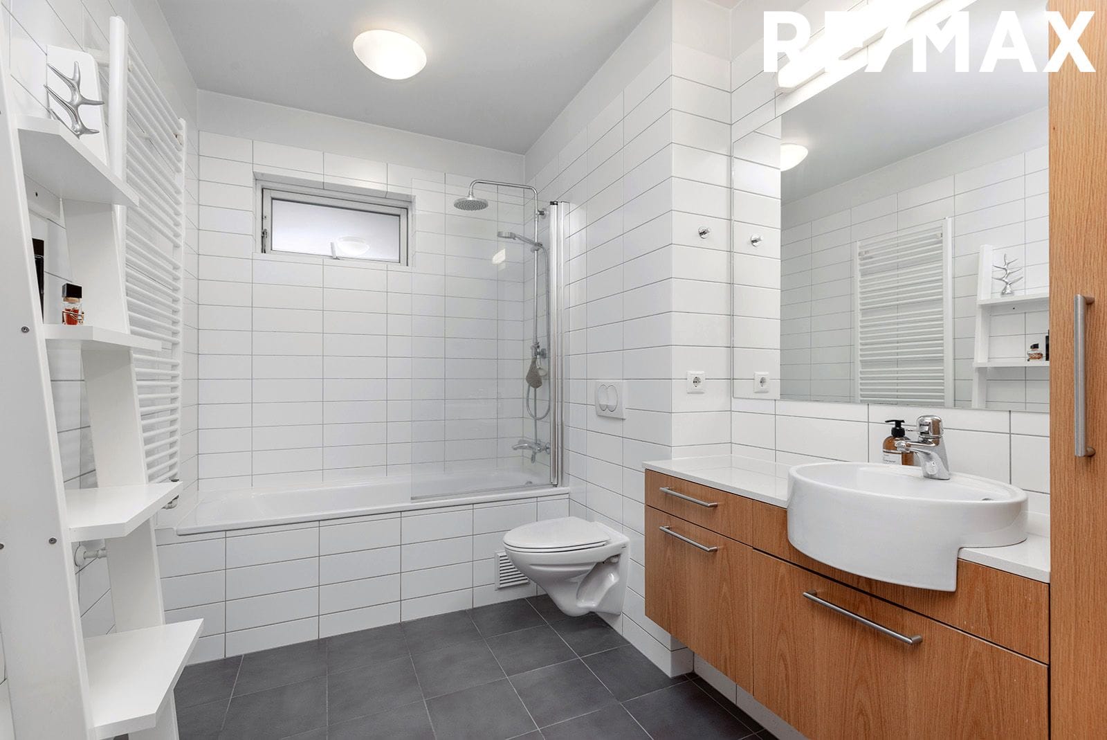 Baðherbergi með flísum á gólfi og veggjum, baðkar með sturtuaðstöðu, sérsmíðuð eikar innrétting með granít borðplötu, hvítum vaski og spegli fyrir ofan, upphengt salerni, handklæðaofn, opnanlegur gluggi.