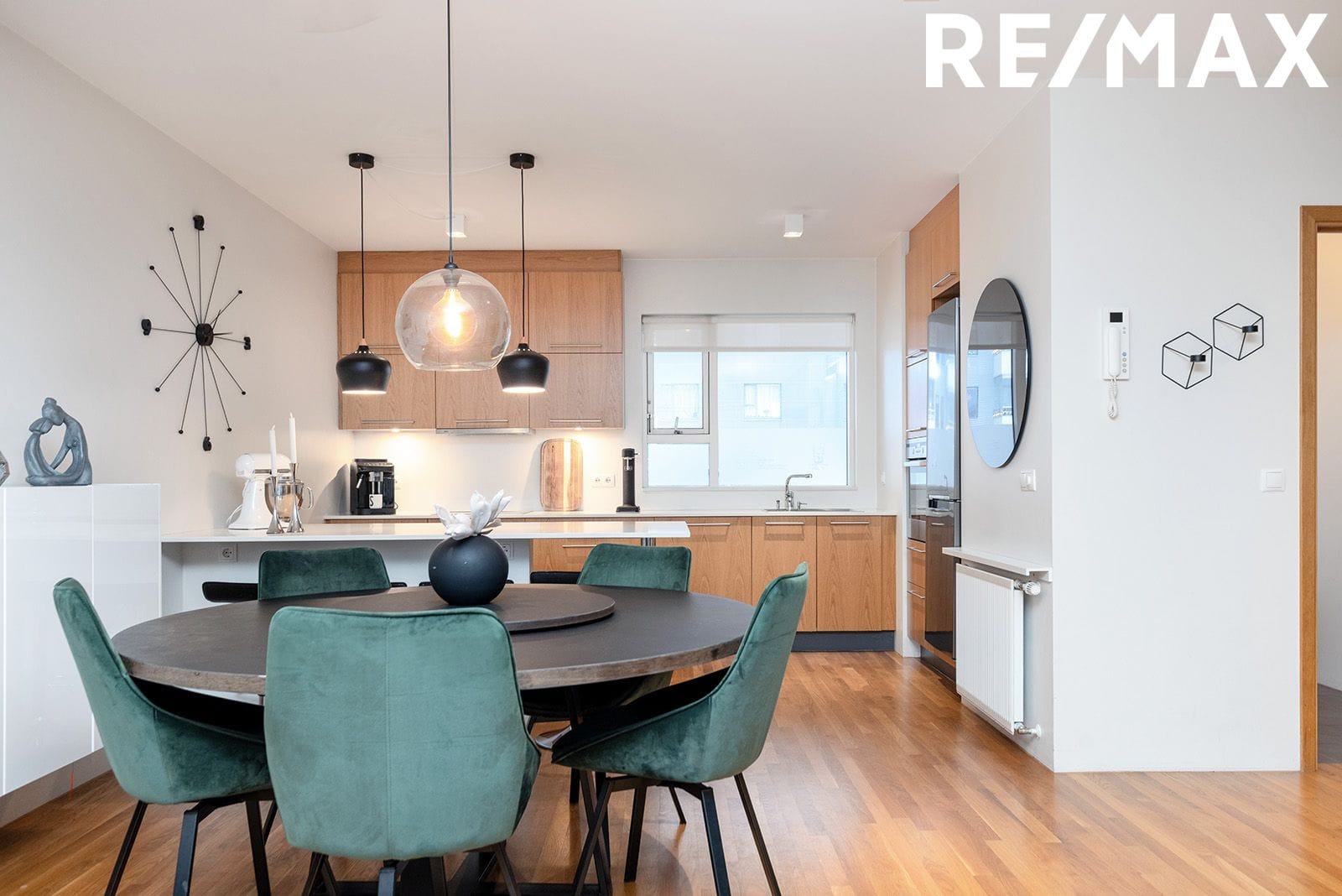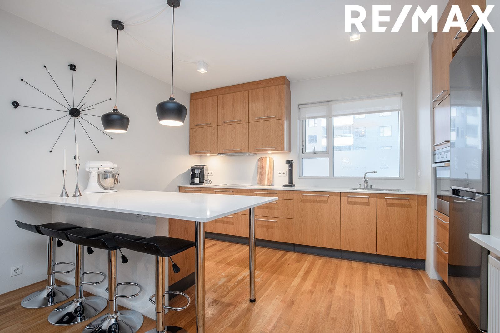 Eldhúsið er opið inn í stofu með fallegri sérsmíðaðri innréttingu úr eik með miklu skápaplássi og ljúflokunum á skúffum, granítborðplata. AEG helluborð með viftu yfir, AEG ofn í vinnuhæð, innbyggð uppþvottavél, gert ráð fyrir háum ísskáp í innréttingu, eyja sem hægt er að sitja við með skúffum með ljúflokunum, granít borðplata, parket á gólfi.