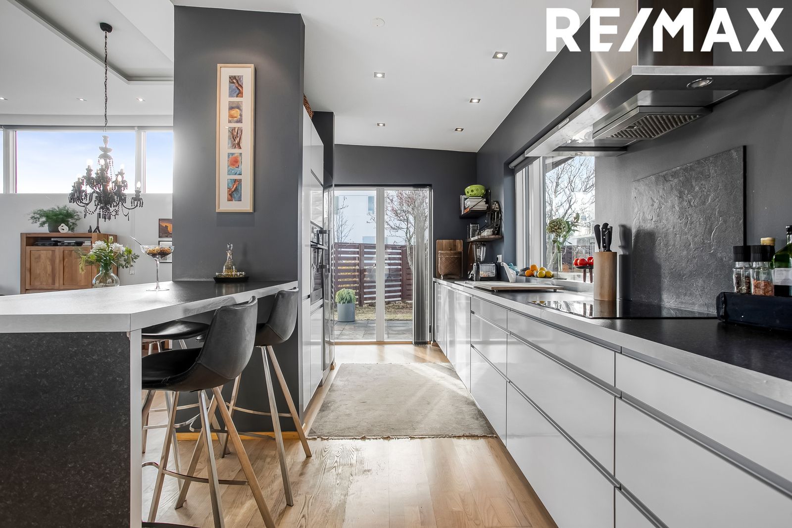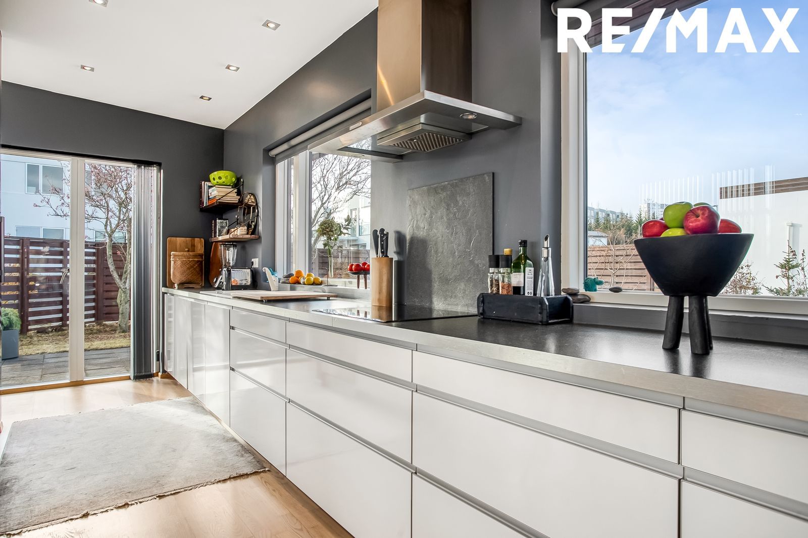 Í eldhúsi eru vandaðar þýskar innréttingar frá Alno og tæki frá Gorenje og Eirvík, útgengi er úr eldhúsi í garð.