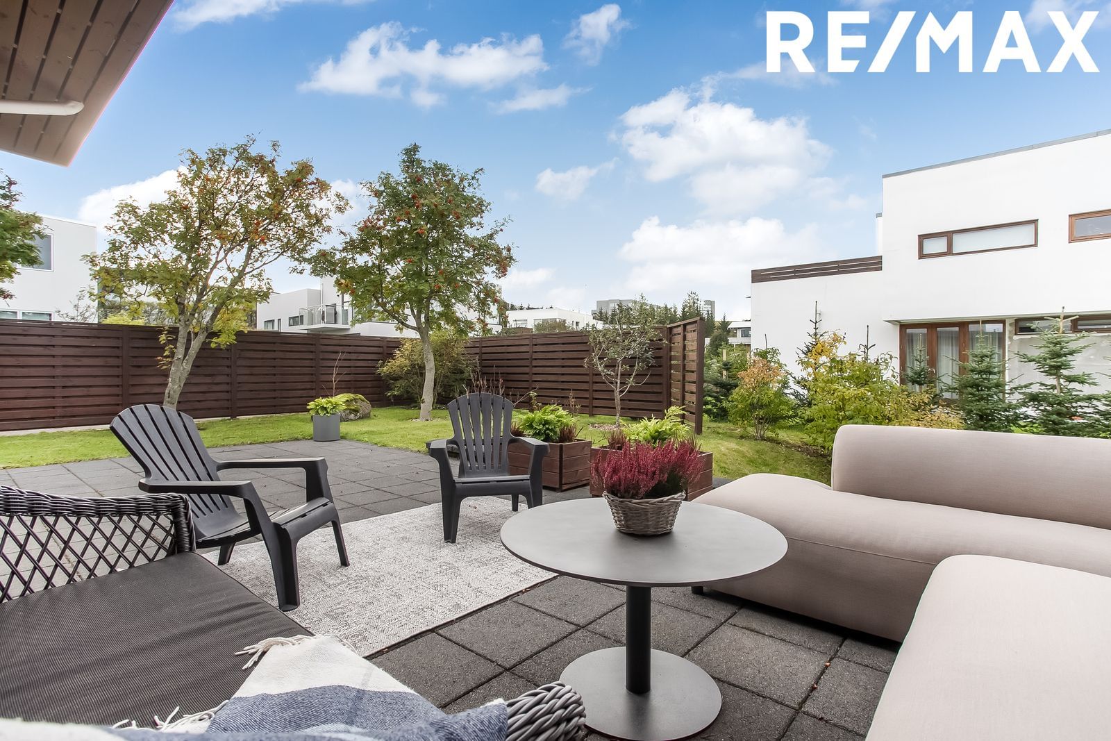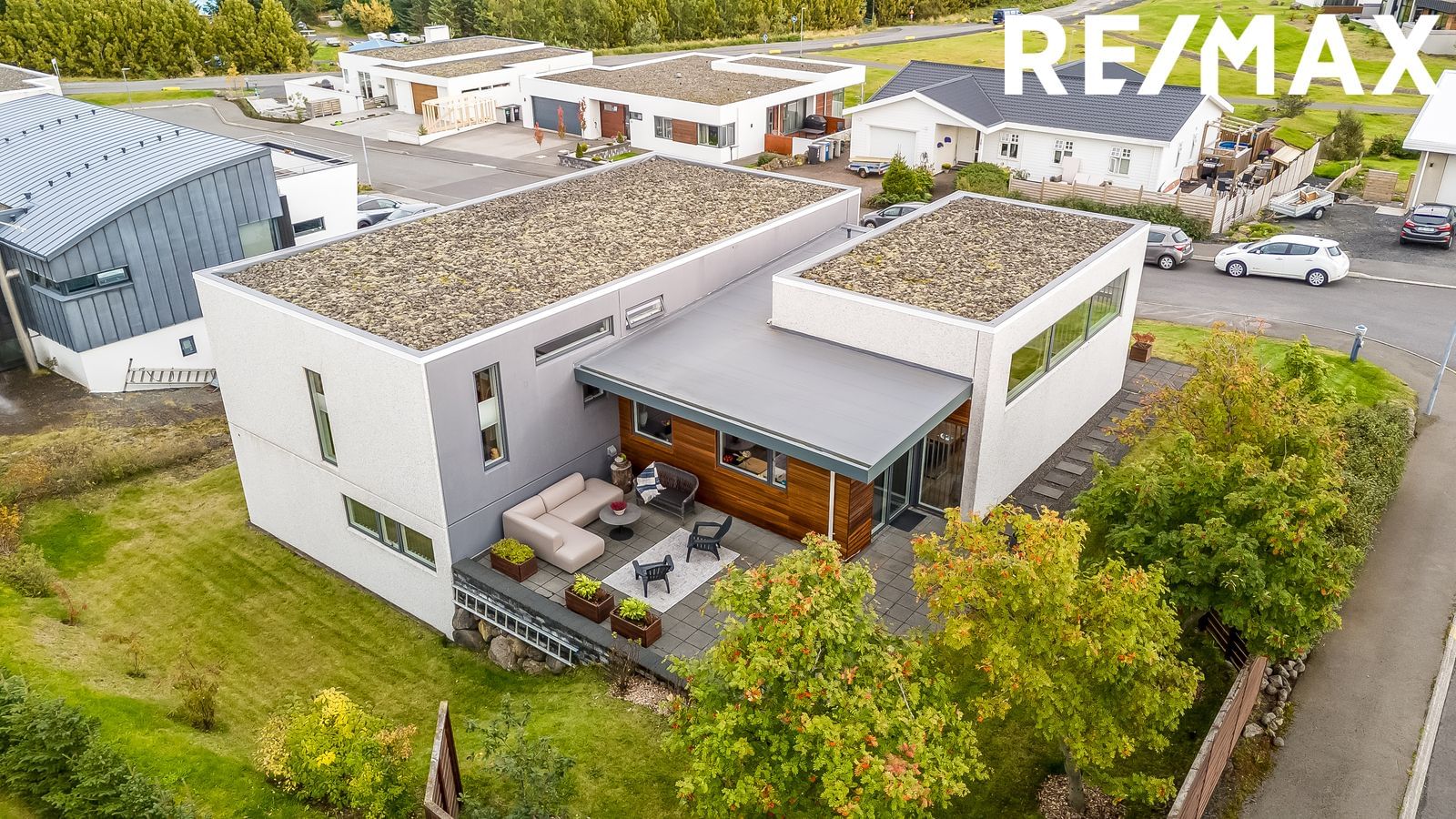 Garðurinn er fallegur og vel gróinn með stórum reynitrjám. Hellulögn í kringum húsið. Stórt hellulagt bílaplan og snjóbræðsla undir allri hellulögn fyrir framan hús. Garðurinn hefur nýlega verið endurhannaður af landslagsarkitekt og liggja fyrir teikningar sem fylgja eigninni.