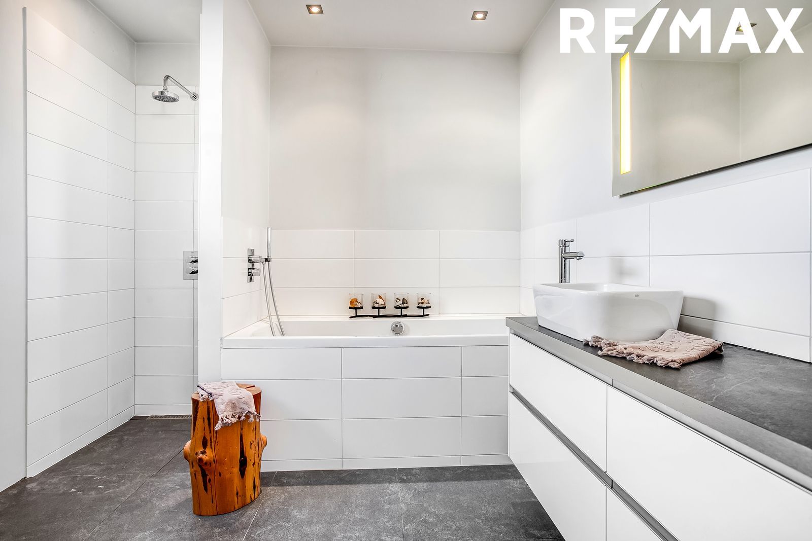 Hjónasvítan er með fataherbergi og sérbaðherbergi með baðkari og flísalagðri sturtu.