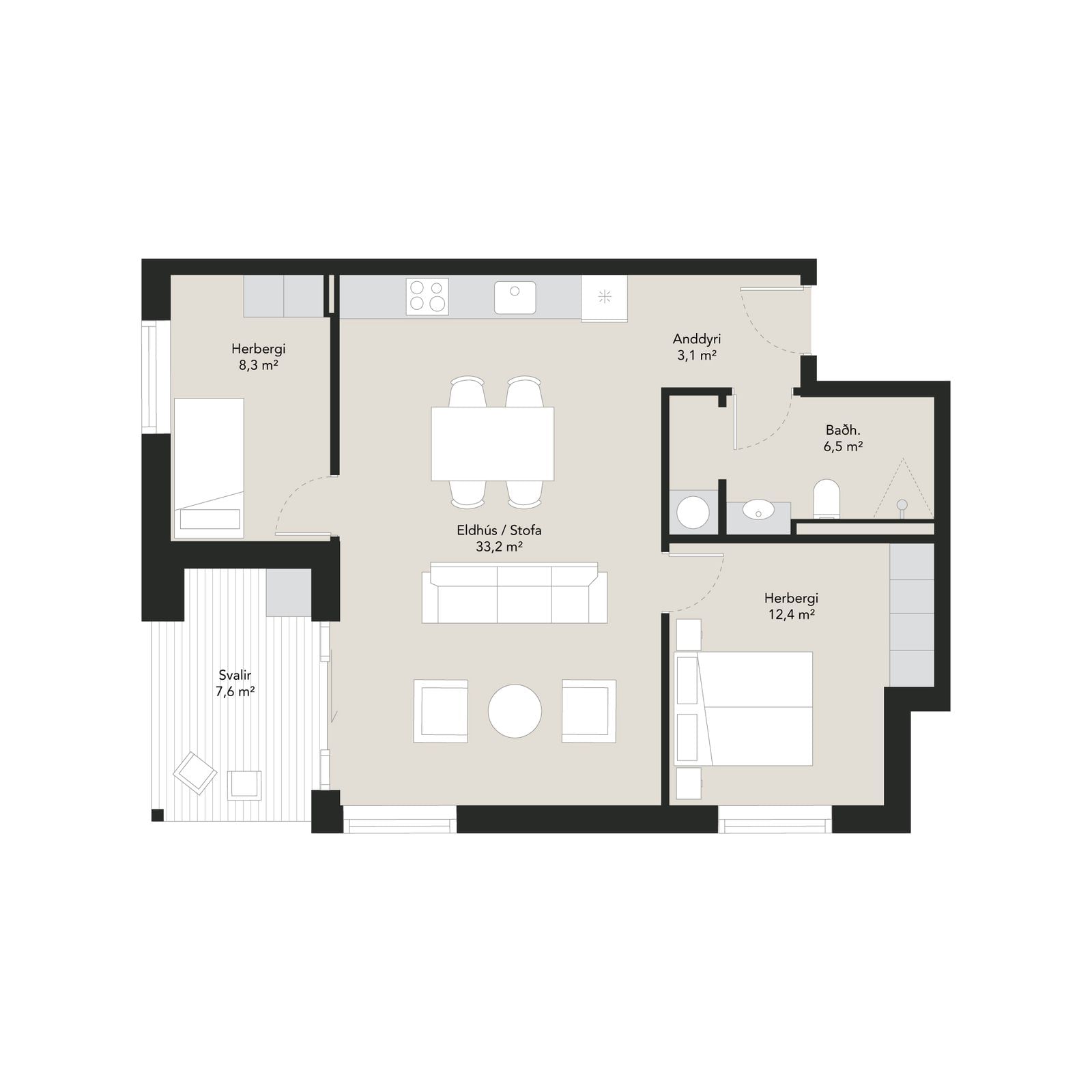 Íbúð 202 er glæsileg þriggja herbergja íbúð á 2. hæð með sérmerktu stæði á lóð. Samkvæmt Þjóðskrá Íslands er eignin 83,2 fm, þar af er geymsla í kjallara 7,9 fm. Útgengt á 7,6 fm yfirbyggðar svalir.