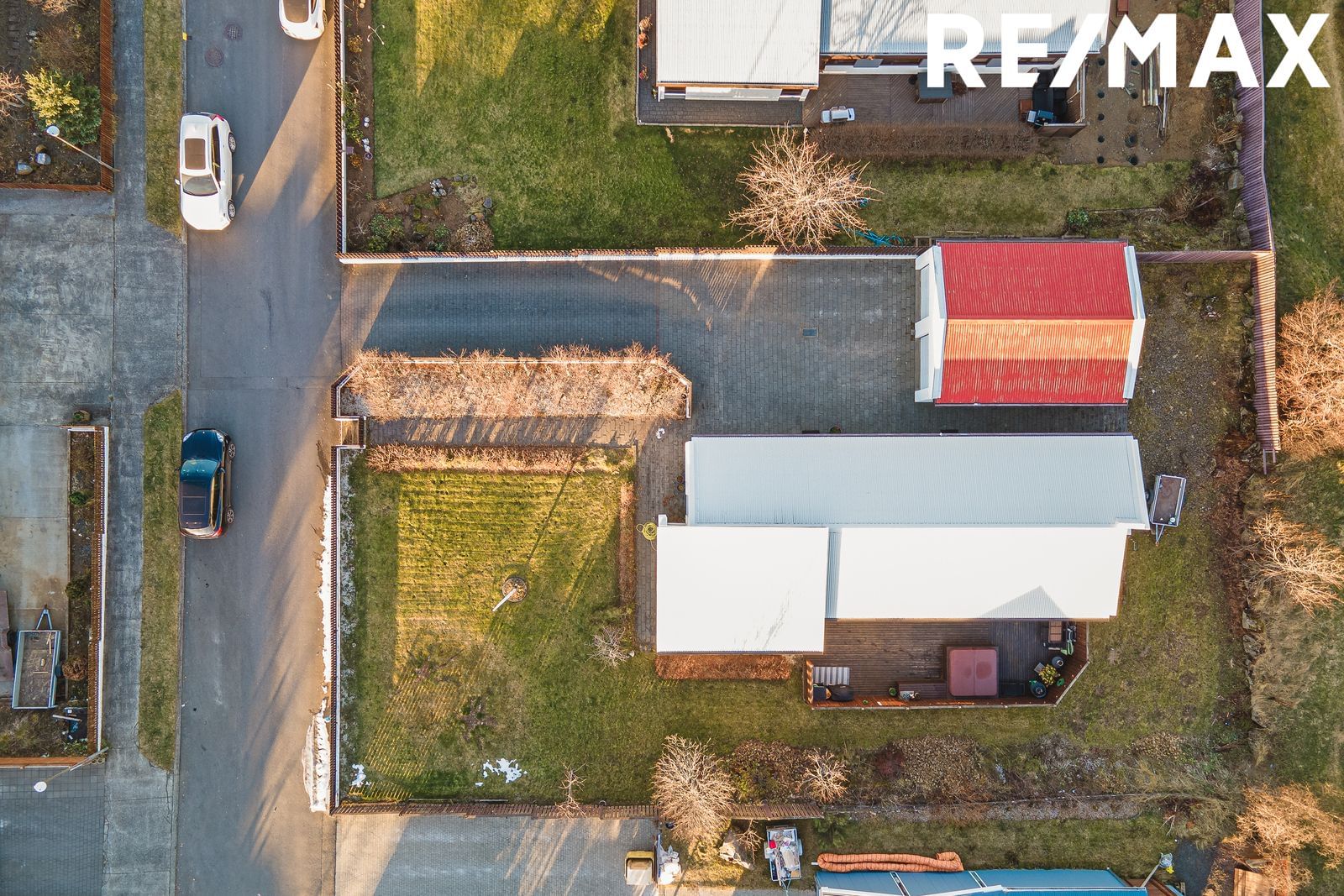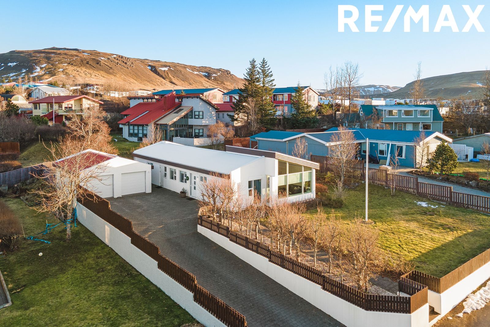 Að utanverðu er sömu sögu að segja. Húsið múrviðgert og málað og tréverk yfirfarið. Skipt var um þak á húsinu (ekki bílskúr) og bílskúrshurðar voru endurnýjaðar fyrir nokkrum árum. Komið er að viðhaldi á norðurvegg sökum veðurálags.