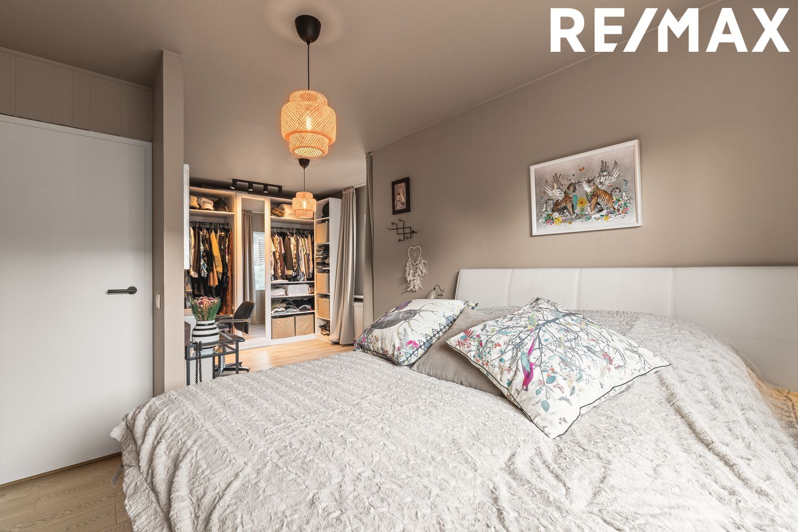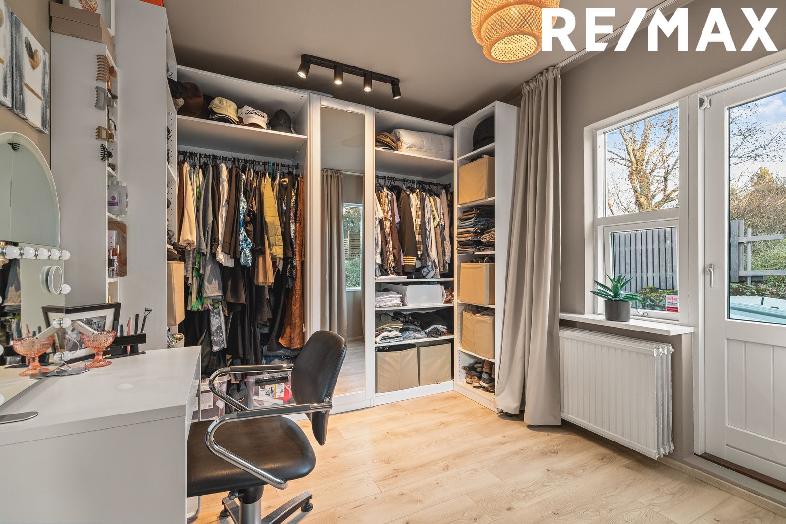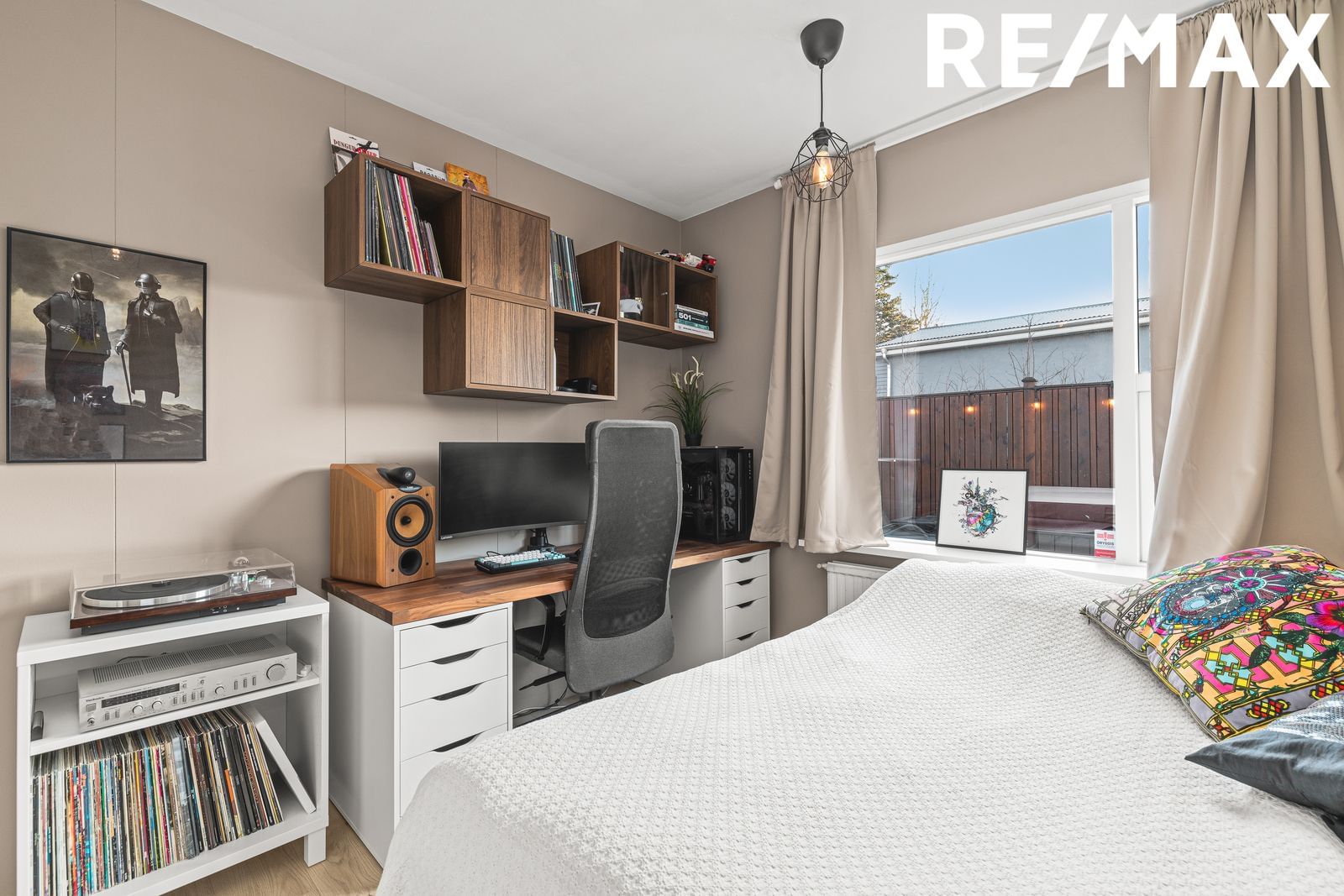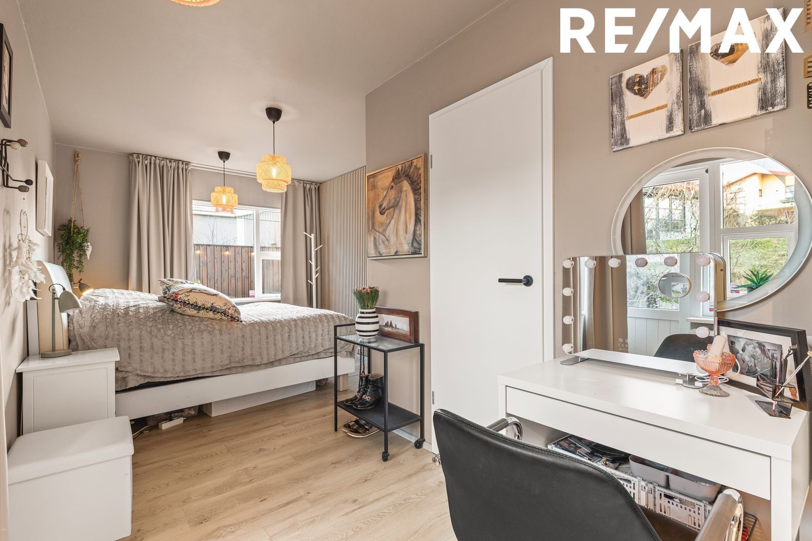 Hjónaherbergi: Rúmgott og hlýlegt með fataherbergi og útgengi út í garð. Parket á gólfi, Hægt að breyta fataherbergi í sér svefnherbergi ef vill.