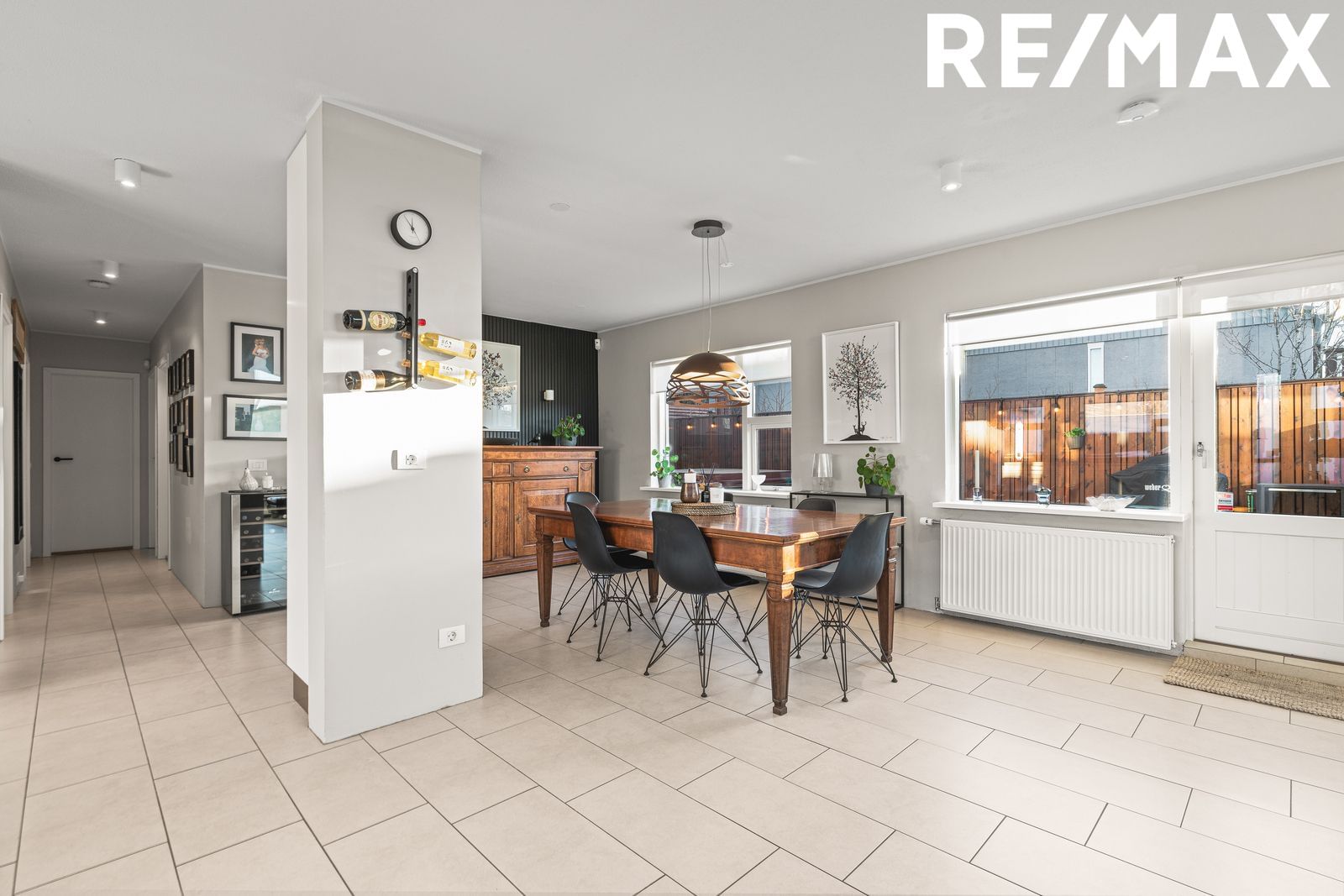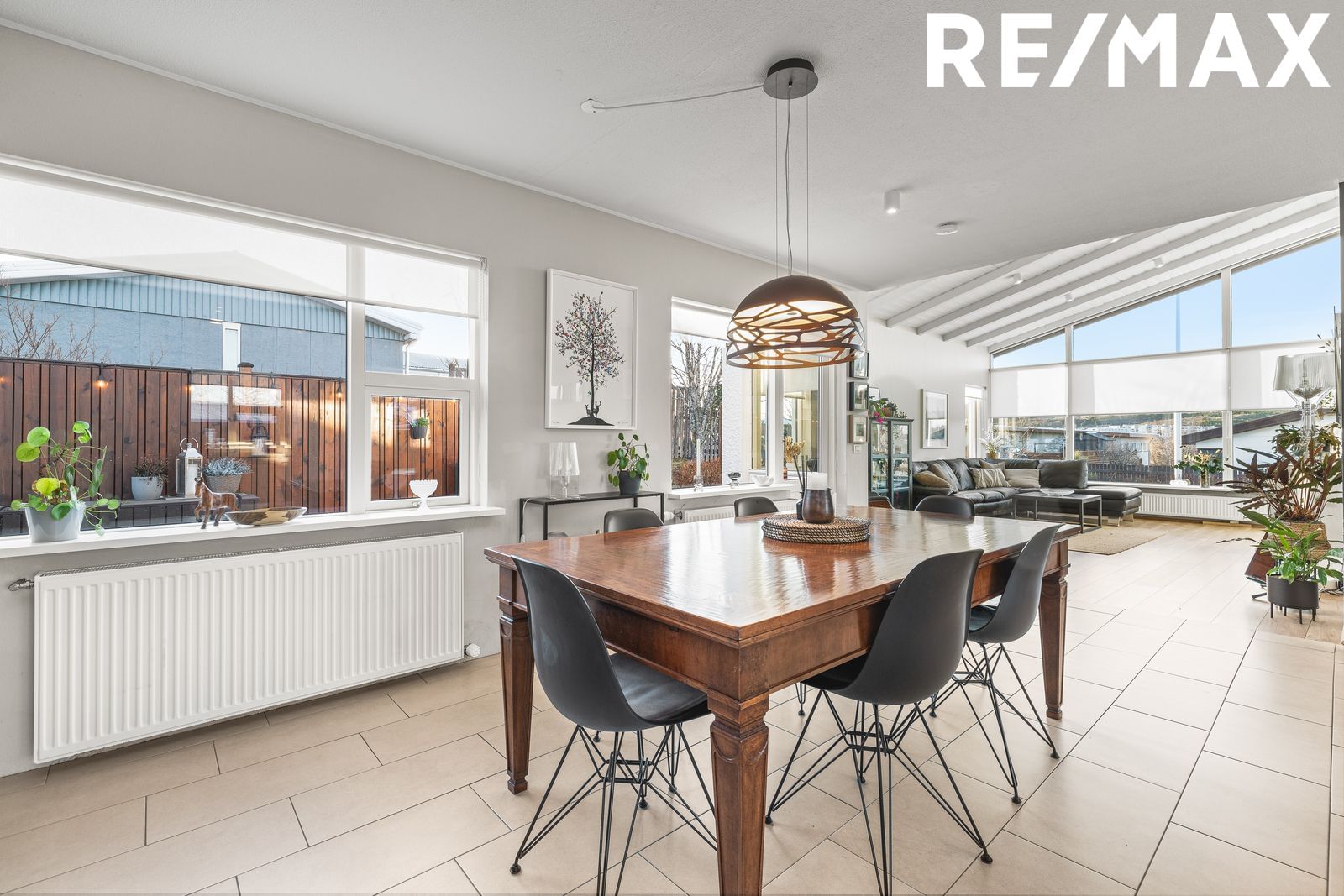 Stofa / Borðstofa : Stofan er rúmgóð með góðri lofthæð og gluggum til austurs og suðurs. Parketi á gólfi. Borðstofa er flísalögð með útgengi út í fallegan garð með skjólgóðum sólpalli. Hægt er að útbúa aukaherbergi í borðstofu ef vill.