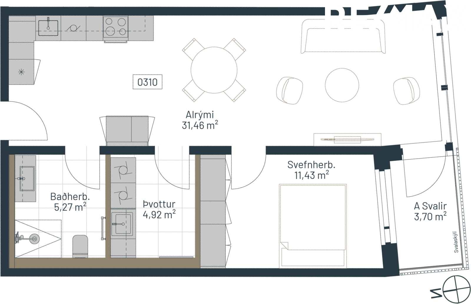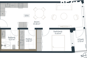 Íbúð 310: Opin og björt tveggja herbergja, 68,1 m2 íbúð á þriðju hæð með suðursvölum og svalalokun. Bambus pallaefni á svalagólfi. Sér þvottahús innan íbúðar með veglegri innréttingu. Sér 5,2 m2 geymsla í sameign.